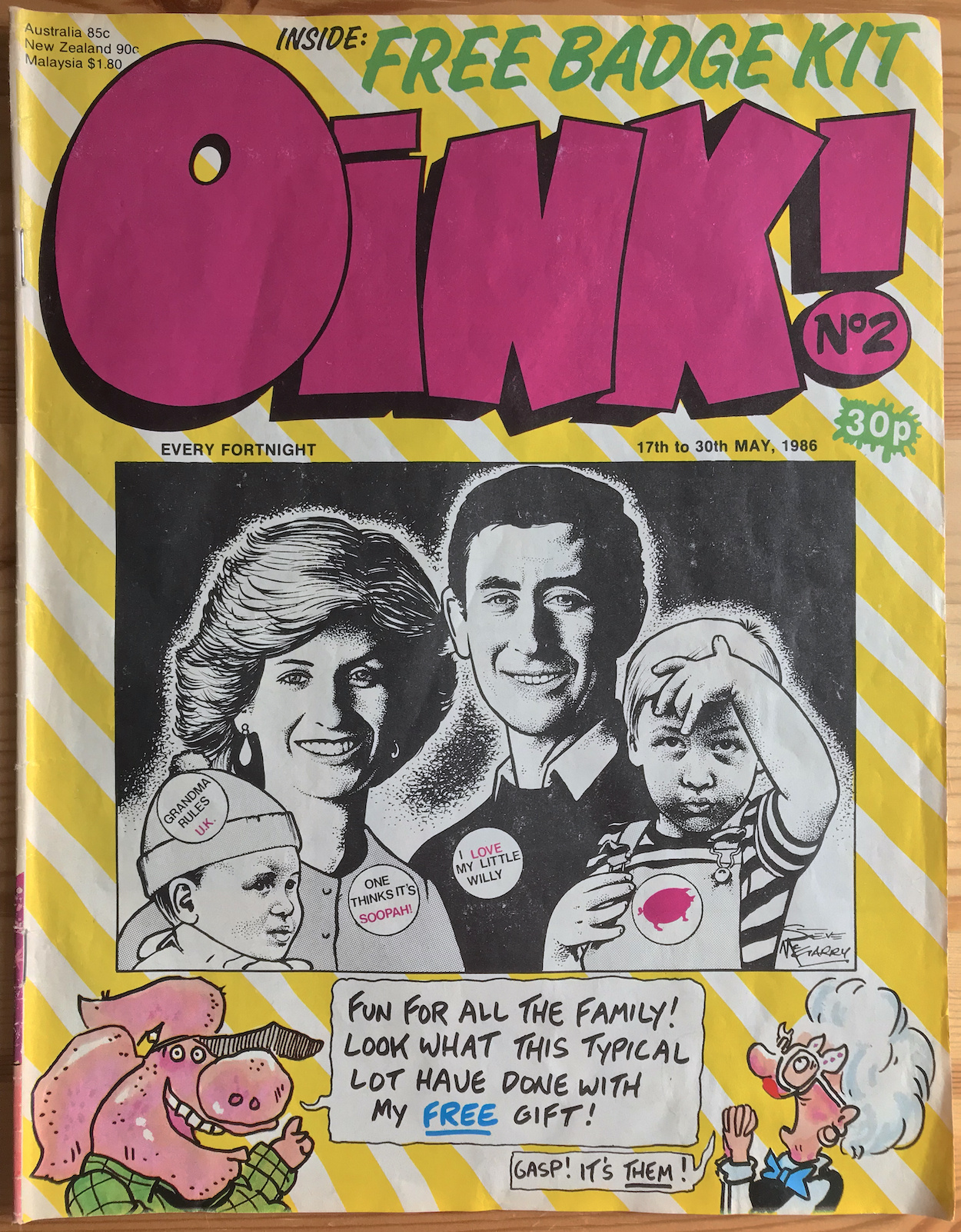 it’s time for the second issue of the world’s funniest comic and the cover sets the ball rolling in typical OiNK fashion. Using the same design as the preview issue, of an artist’s illustration framed above Patrick Gallagher‘s Uncle Pigg and Mary Lighthouse, this has proved to be very memorable over the years amongst fans.