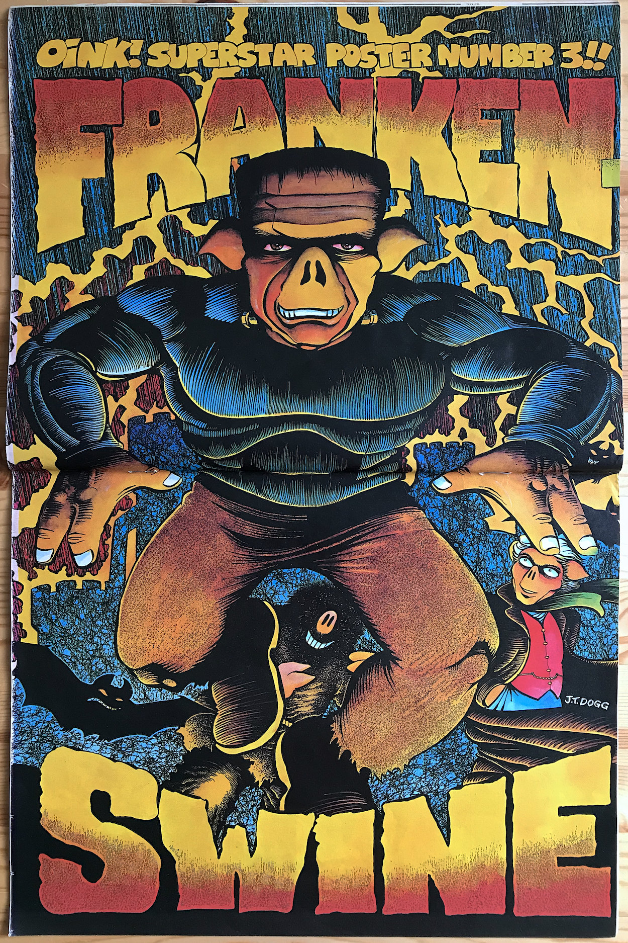 But of course, OiNK also had more striking full colour pages than any other funny comic and none would use this to greater effect than J.T. Dogg, so while we’re on the subject here’s his latest Superstar Poster, Frankenswine!