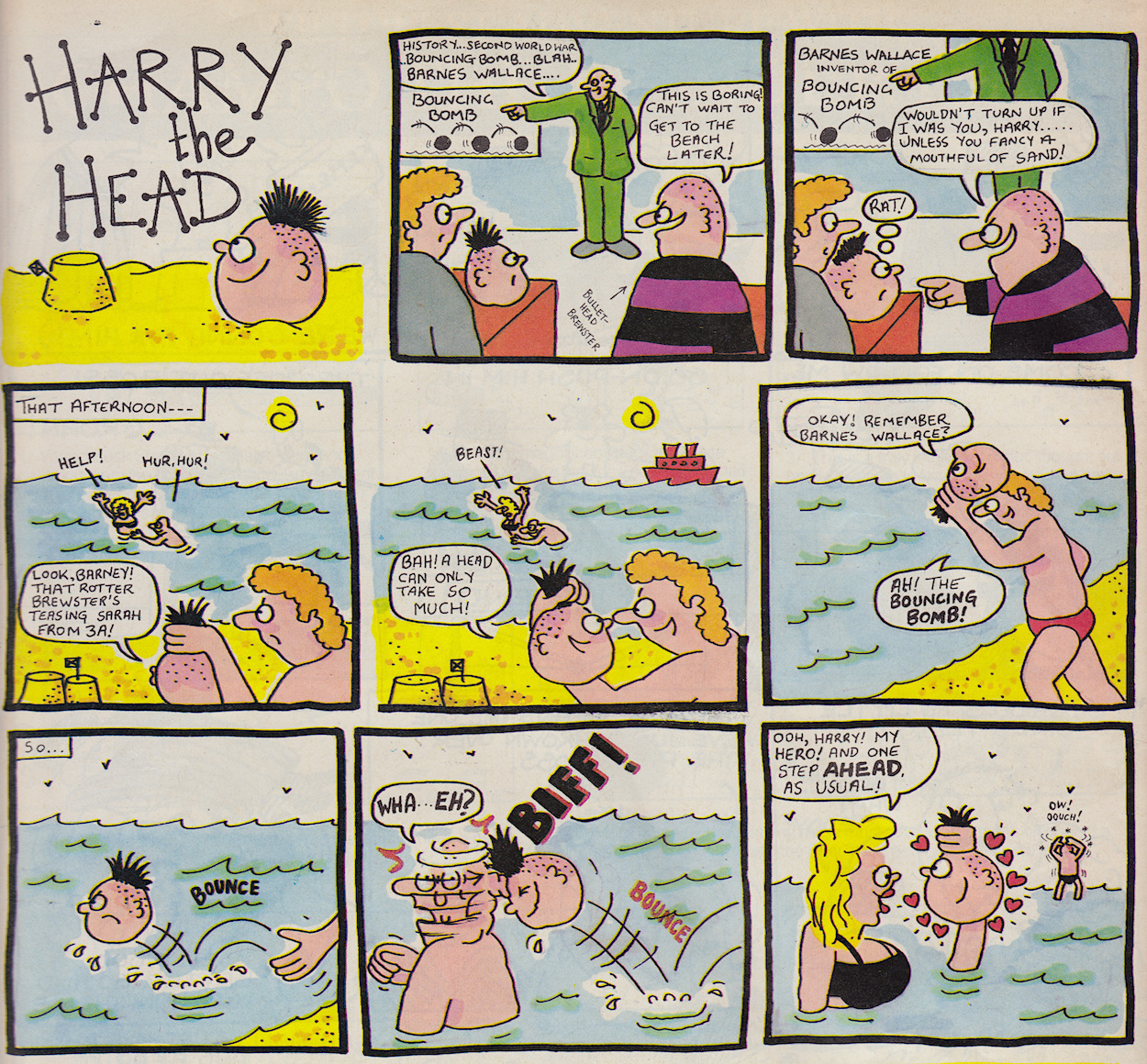 We stick with Marc for the back page and our final highlight. Probably Marc’s most fondly remembered creation after Snatcher Sam was Harry the Head, the tale of an ordinary boy who just happened to be a disembodied head. In the preview issue Harry’s parents were also just heads but a later strip would change this to involve a genie, a greedy young boy and a lesson learnt.