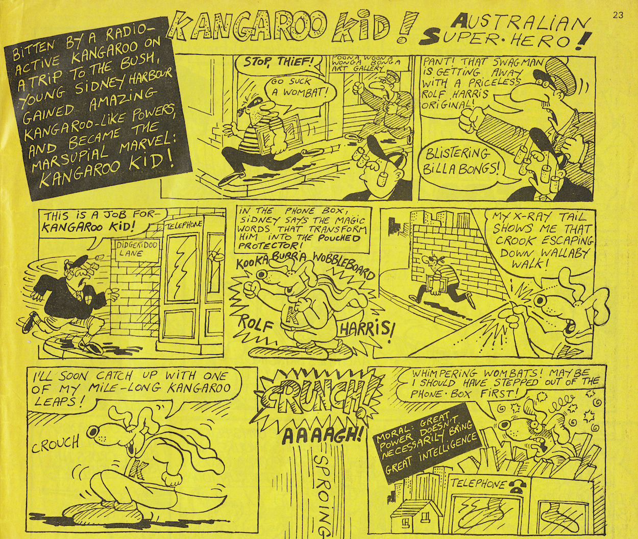 Burp and Mr Big Nose creator Jeremy Banx‘s Kangaroo Kid leaps (sorry, I couldn’t resist) off the bright yellow page, ending with the reader actually taken by surprise with the blatantly obvious fact he hadn’t exited the phone booth yet. A brilliant piece of misdirection and comic timing.