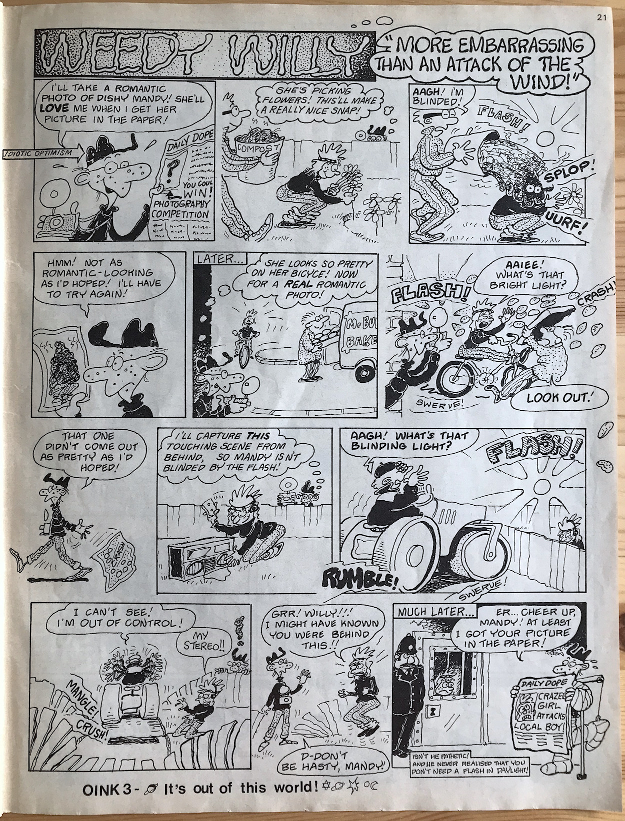 While Willy’s weediness (expertly rendered by Mike Green) was the subject of the humour, he was never portrayed as a victim. Yes, we could laugh at his inability to lift the lightest of objects or his fears of the cutest, cuddliest babies, but whenever the strip put him up against a bully he’d always come out on top, even if it was inadvertently. He even started to date Mandy later in the run. His positivity was infectious and the moral was clear, albeit delivered in an original OiNK fashion.