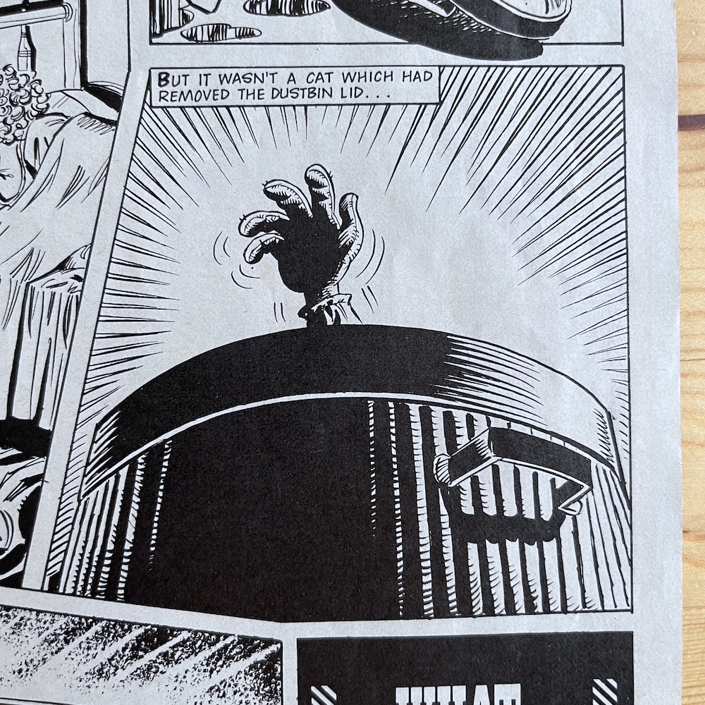 I just laugh so hard at how expressive John’s version of the character is. Despite a shark being somewhat limited in details, John’s expert way with Gums’ eyes can convey everything from sadistic humour to intrigued, self-importance or even fear! I adore his drawing of the white whale too. As for what appears to be some kind of distant, abandoned underwater city and a briefcase or petrol can in the first panel, I’ve no idea. I’ve even asked some experts and we’re none the wiser. It just seems too specifically drawn to be some random background detail. Perhaps it refers to something from a previous Gums strip.