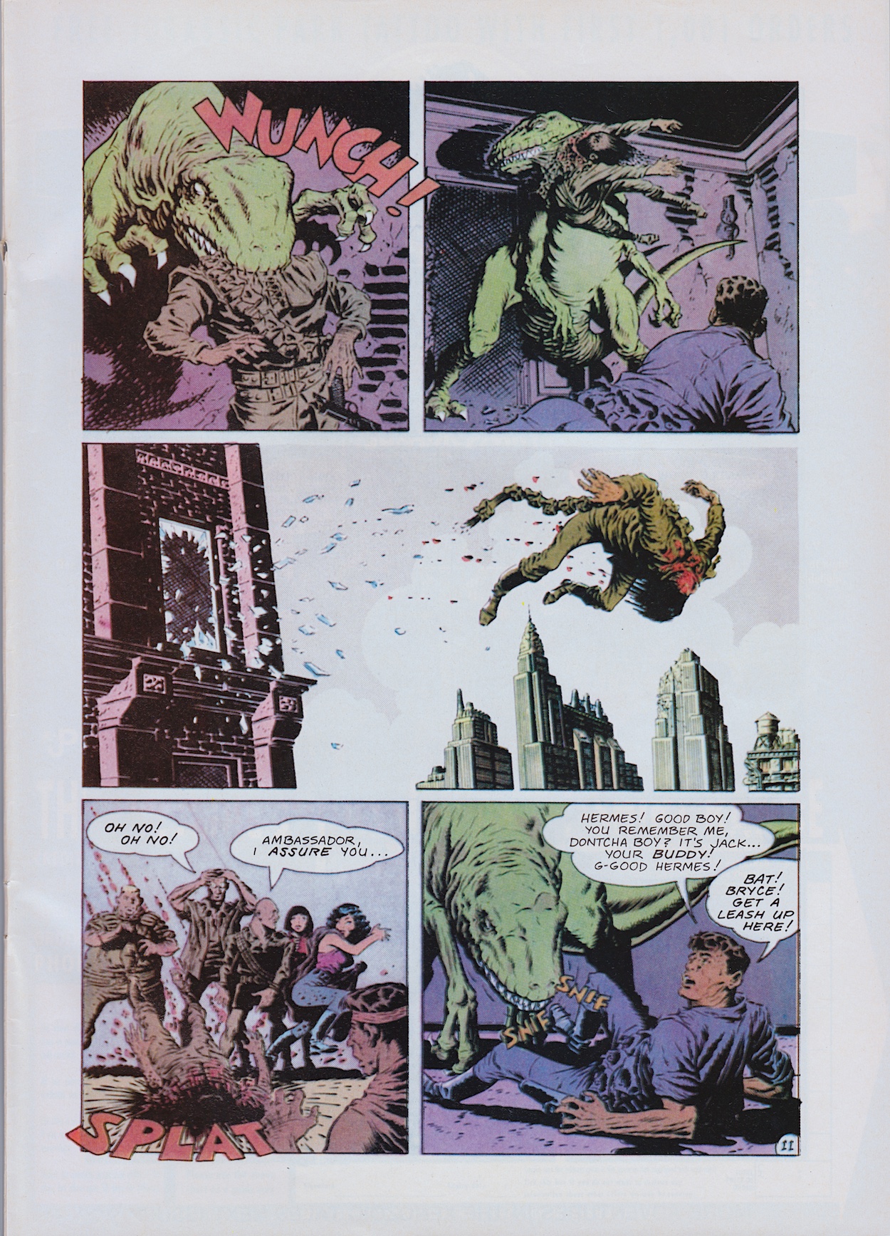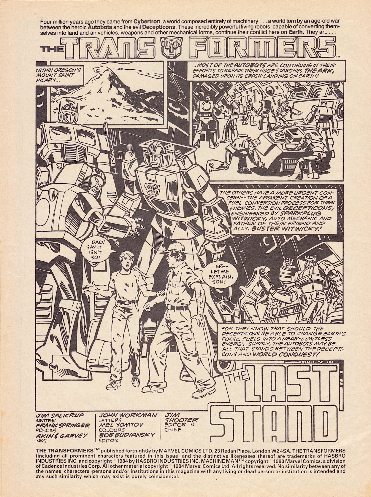 The main strip was still telling the origin story of the Transformers’ arrival on Earth, concluding in the next issue. The Last Stand: Part One was written by Jim Salicrup (editor on Spider-Man, Uncanny X-Men, Bram Stoker’s Dracula), pencilled by Frank Springer (Savage She-Hulk, Green Arrow, G.I. Joe), inked by Ian Akin and Brian Garvey (partnered on ROM, Iron Man, Firestorm) and lettered by John Workman (Jurassic Park, Incredible Hulk, Star Slammers), his work always recognisable with open balloons and captions along panel edges.