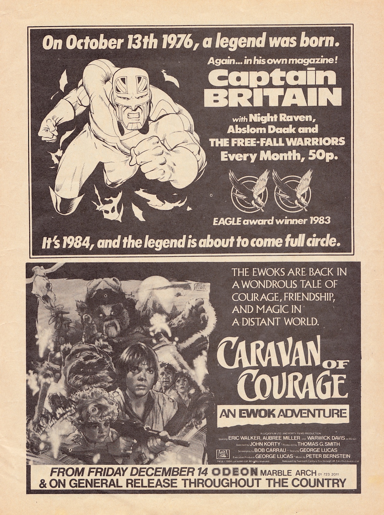 Speaking of other Marvel comics, here’s an advert for the monthly Captain Britain and below that the big Christmas movie was… Caravan of Courage? I’ll be honest, I’ve never heard of this Star Wars spin-off. This page interrupts the strip mid-flow. Much like the US comics these early editions break the strips up into several pieces with adverts and features seemingly randomly throw in here and there.