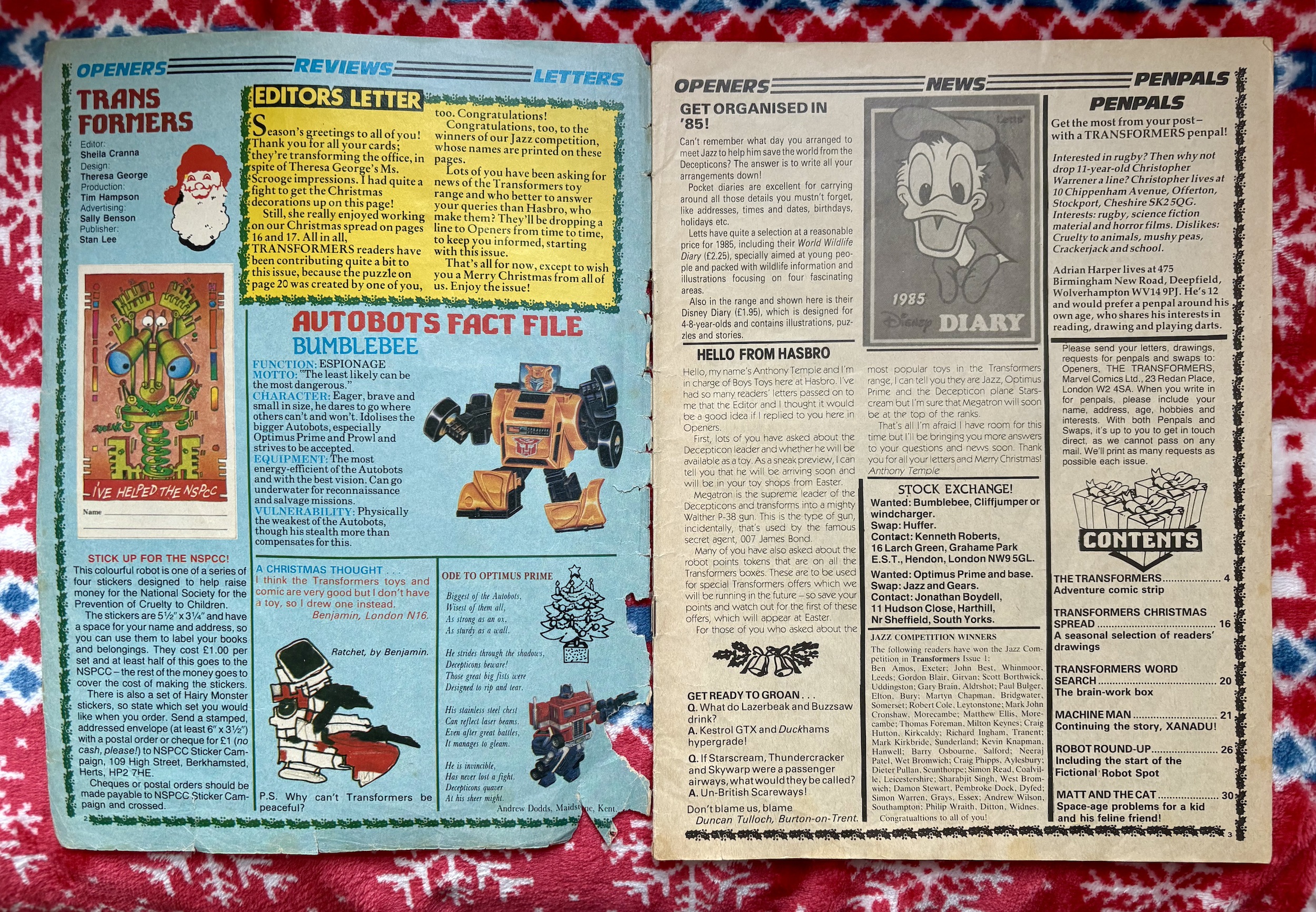Originally a 32-page fortnightly made up of colour and black-and-white pages with its contents spread sporadically through each issue, it’s a far cry from the weekly format it would become known for later. Launch editor Shiela Cranna adds a couple of captions to the cover and a Christmas message in the two-page editorial, which contained a mixture of Transformers news and random items they thought would appeal to readers.