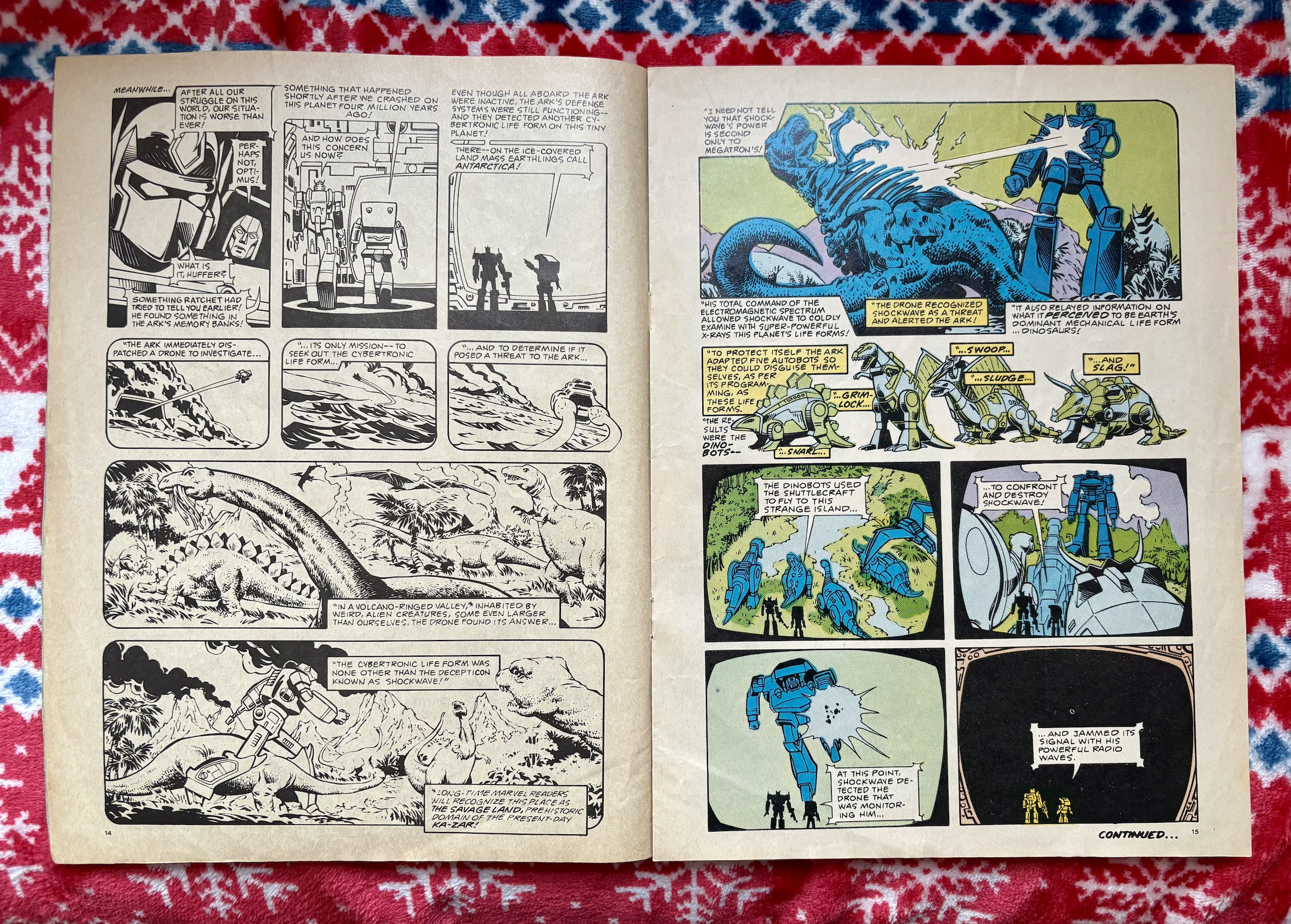However, this is the big event of the issue, the introduction of the Dinobots! It’s a strange page to choose for colour given how it’s a flashback and in muted tones, but it was no less exciting for the young readers. Millions of years previous The Ark had detected more Transformer life and it relays how its surveillance drone had discovered Shockwave and created what it believed to be a disguise for five of the most powerful Autobots on board.
