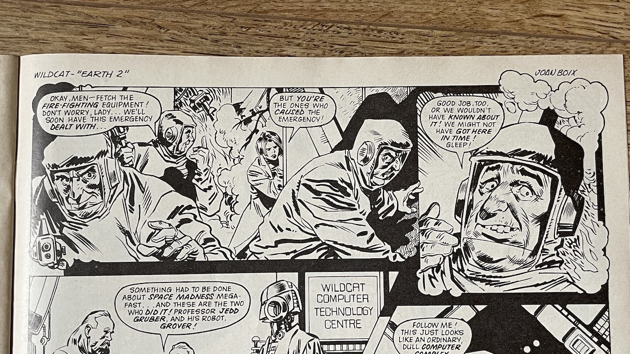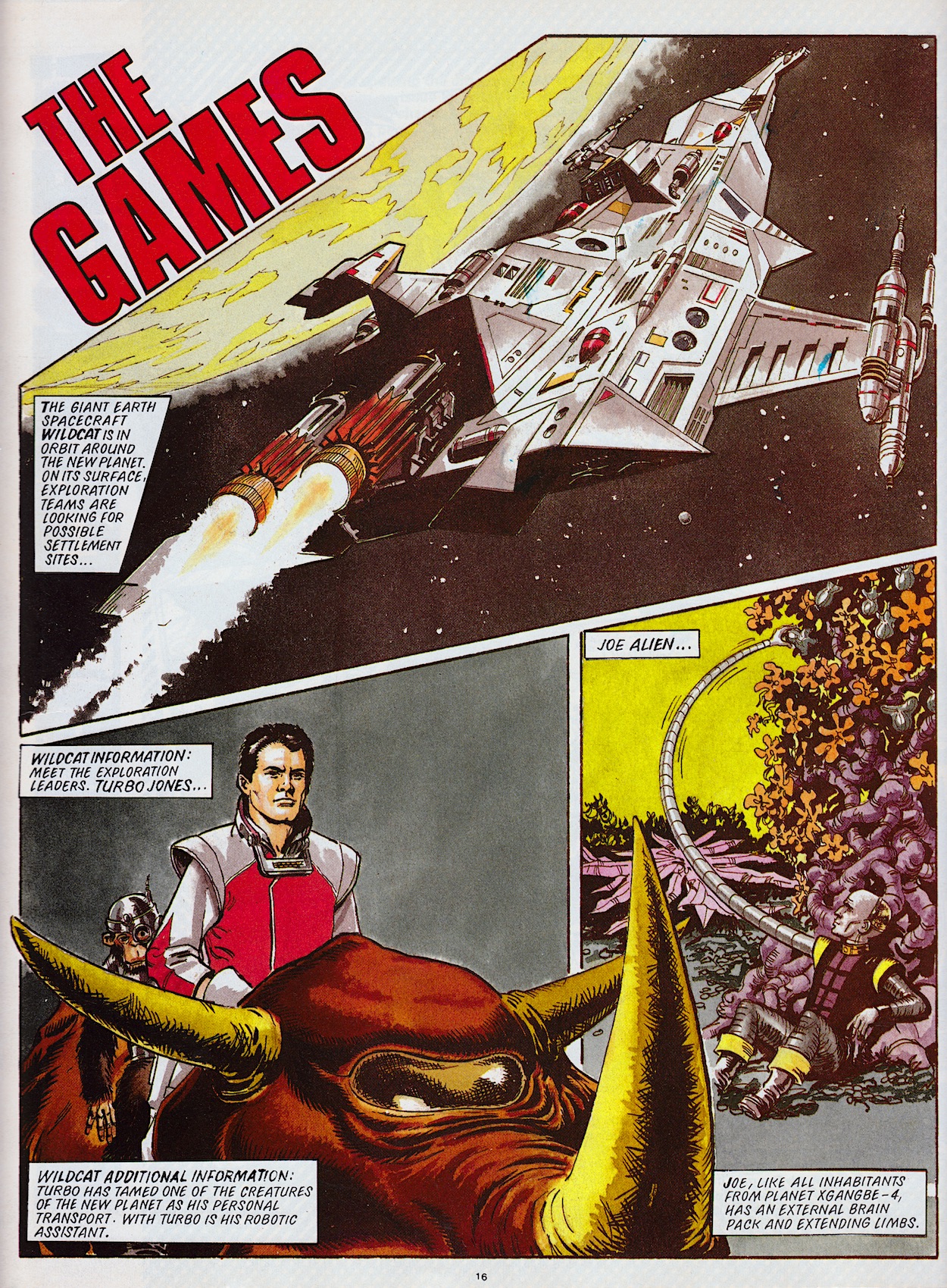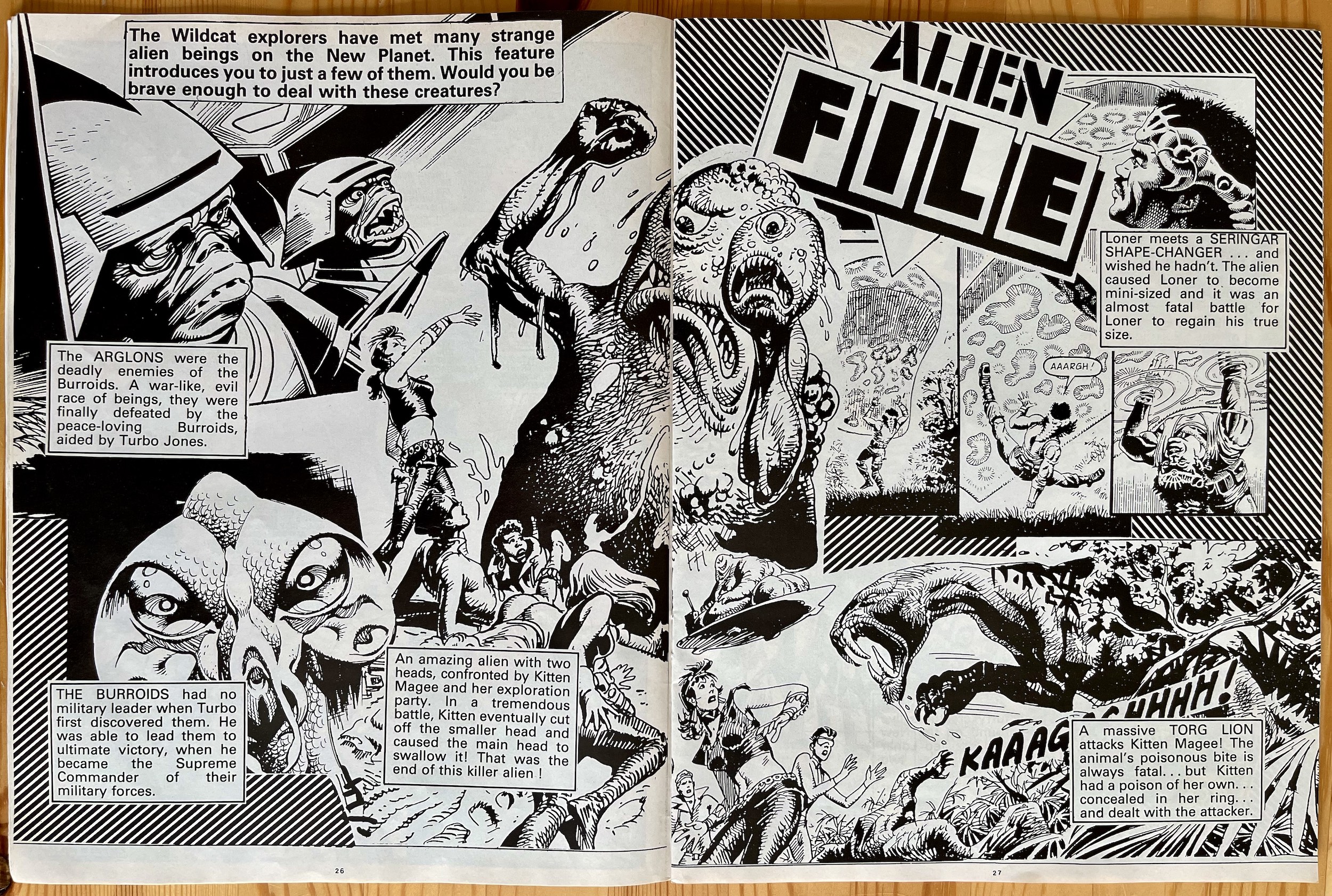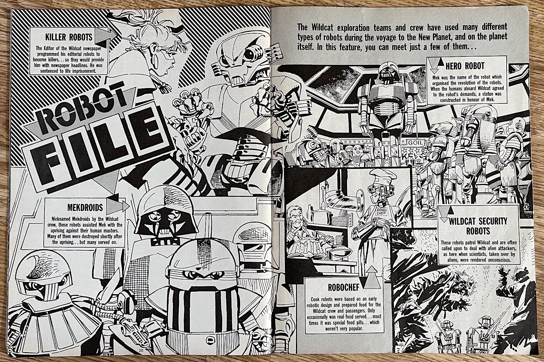 The complete tale this issue simply gets ‘The Wildcat Complete‘ as its banner but at the top of every page artist Joan Boix has written “Earth 2” so that’s the actual title. This correlates with the front cover, which would have us believe a planet called Earth 2 has killer robots on it. (Quick note: This was six years before the short-lived TV series of the same name.) The planet the landing parties are exploring is called Targon-5 (not actually named in the strips, it was named as part of the free gift with #1 and mentioned in its Next Issue promo), so what’s this all about? Colour me intrigued.