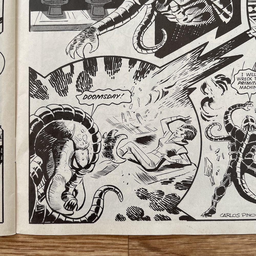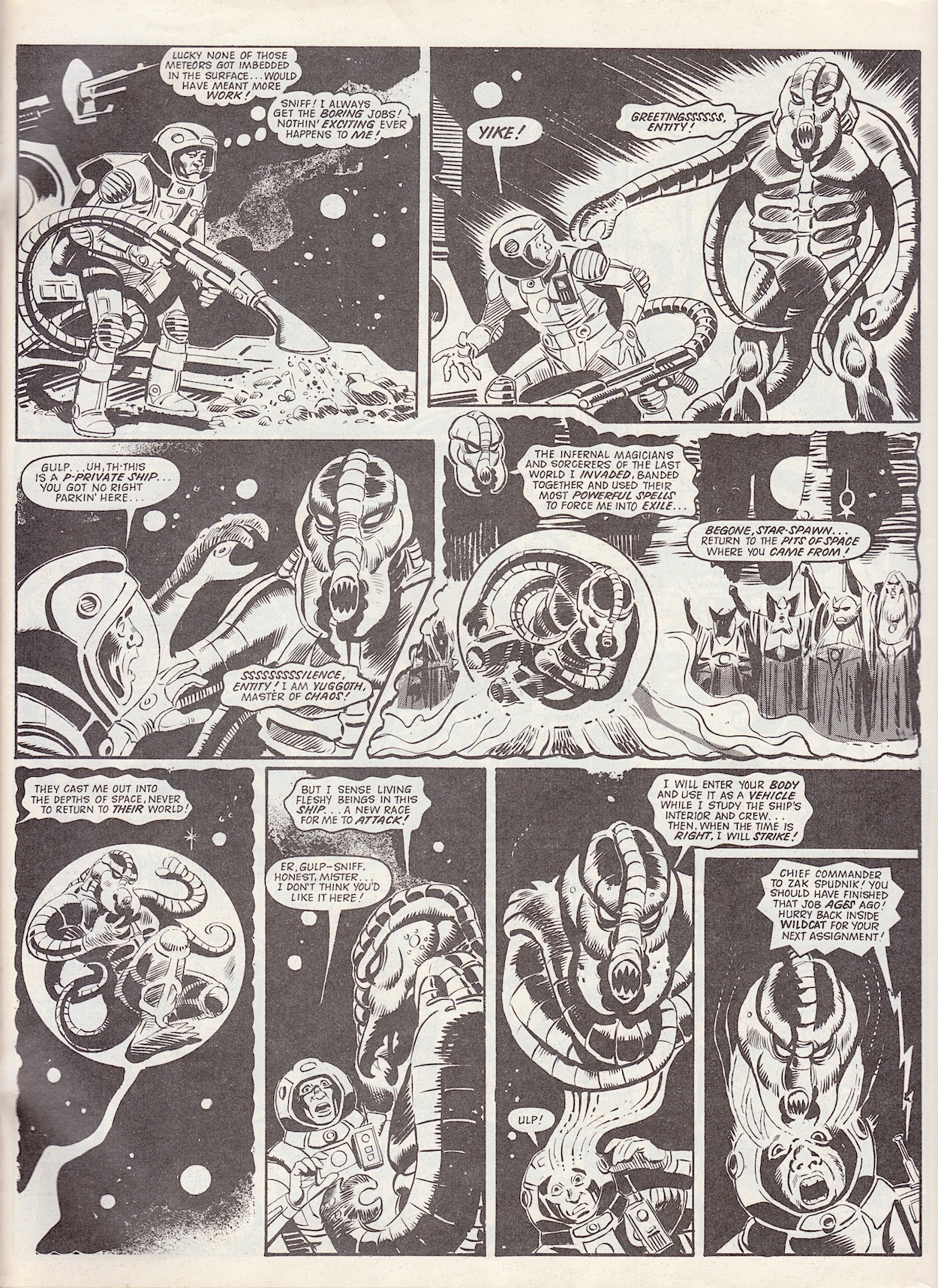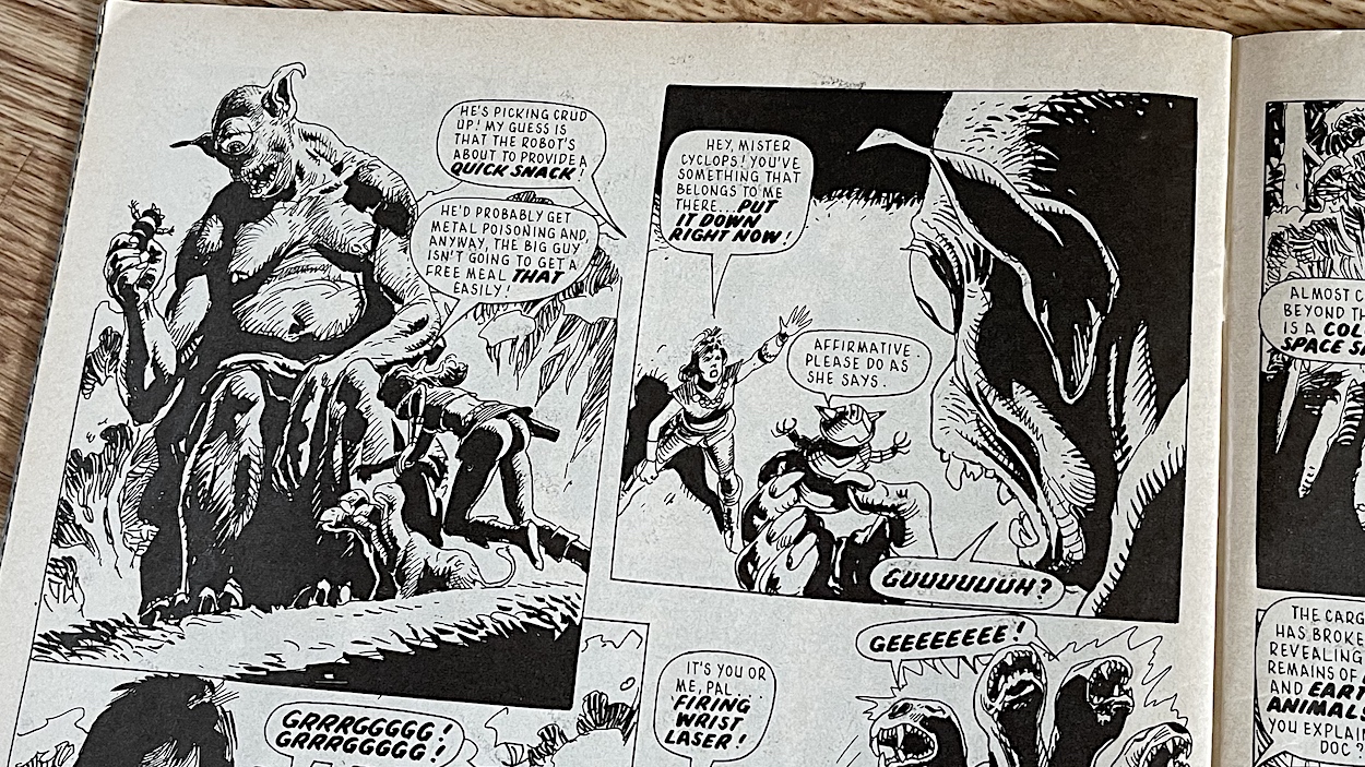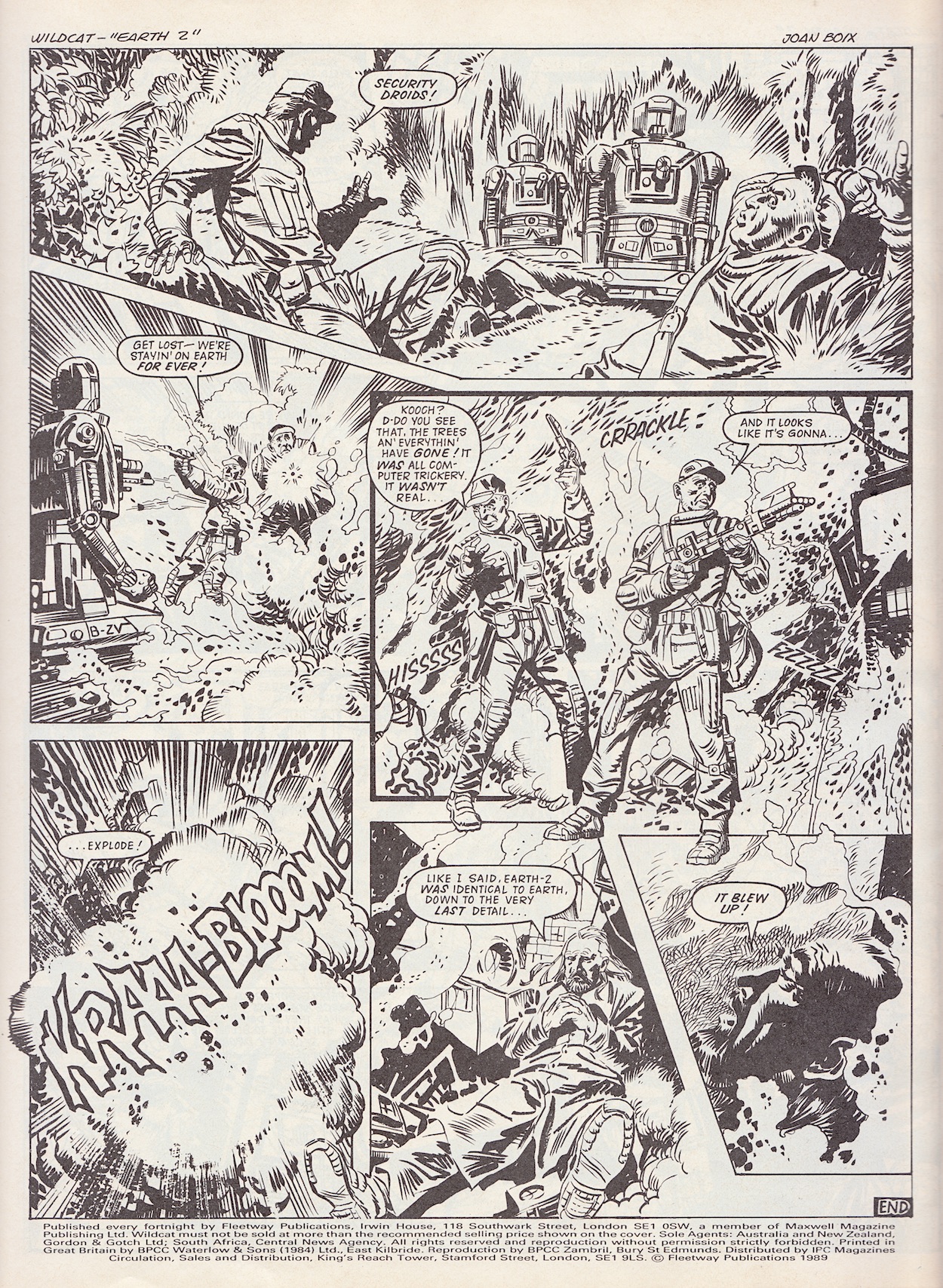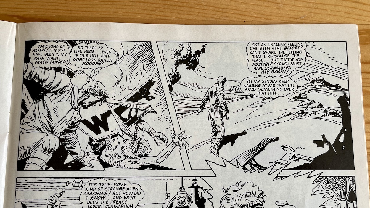 The complete tale this issue simply gets ‘The Wildcat Complete‘ as its banner but at the top of every page artist Joan Boix has written “Earth 2” so that’s the actual title. This correlates with the front cover, which would have us believe a planet called Earth 2 has killer robots on it. (Quick note: This was six years before the short-lived TV series of the same name.) The planet the landing parties are exploring is called Targon-5 (not actually named in the strips, it was named as part of the free gift with #1 and mentioned in its Next Issue promo), so what’s this all about? Colour me intrigued.