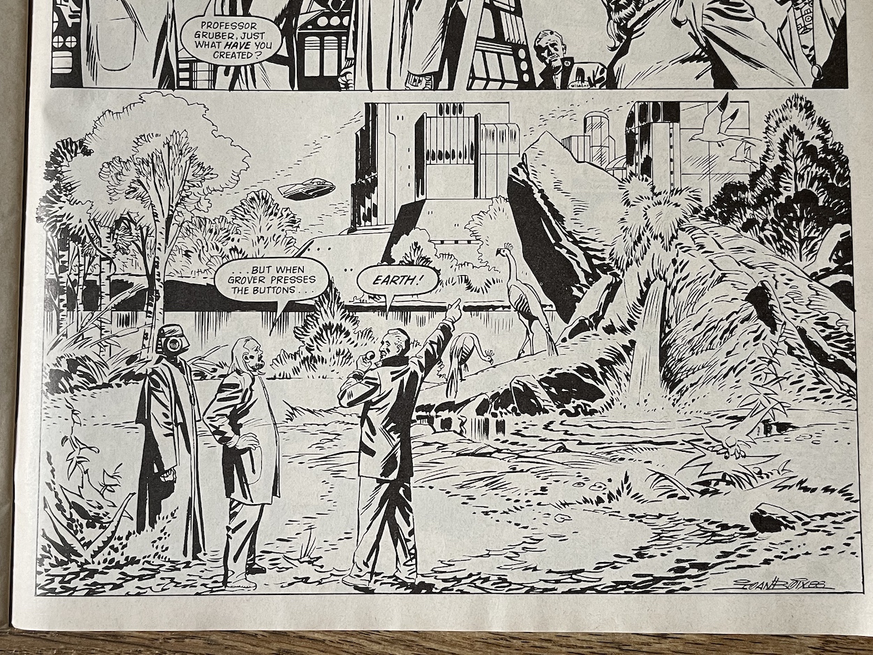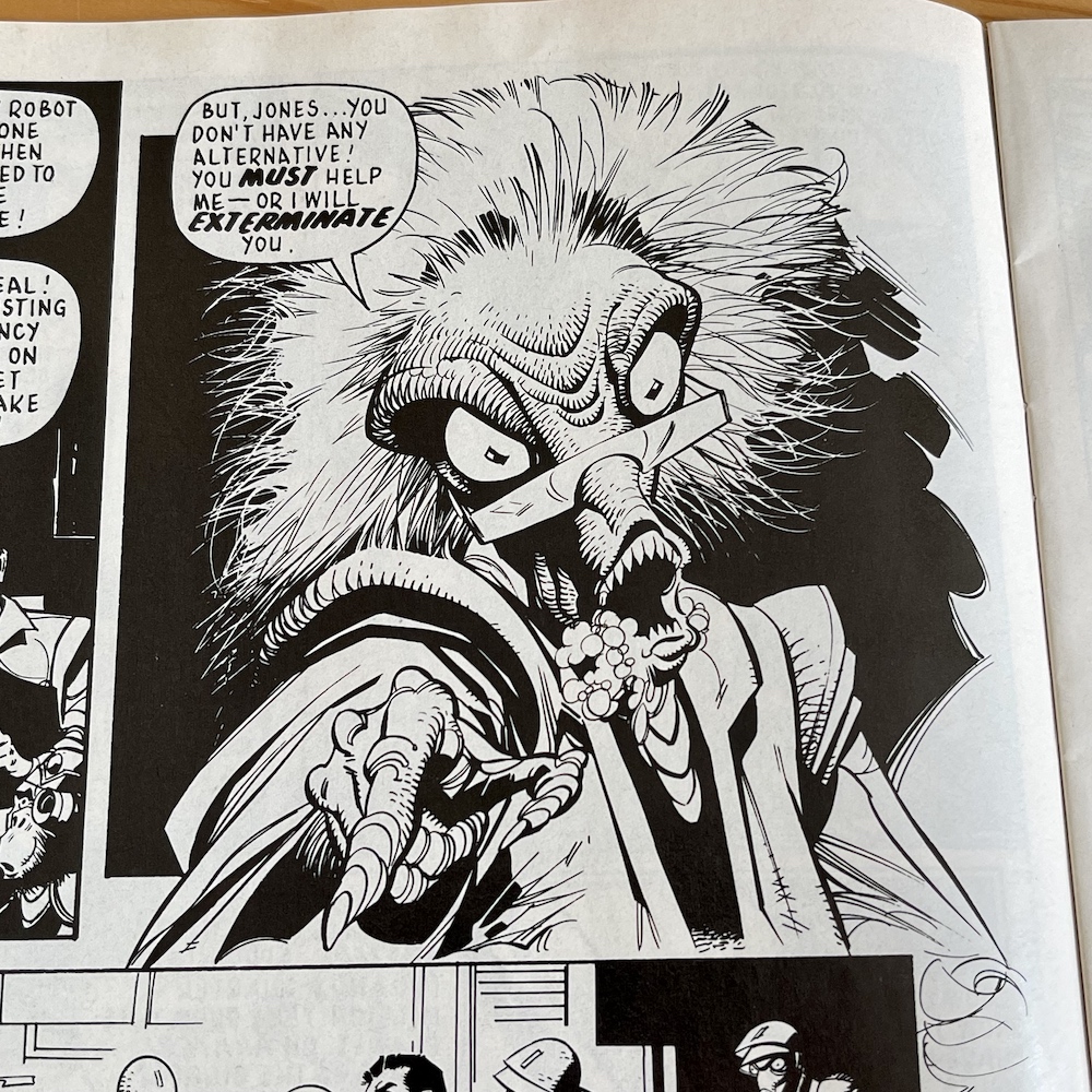 Oh come on now, this is getting a bit ridiculous. While it’s wonderful to see David’s art again and there are some genuinely funny moments, such as Loner cursing the fact his first reaction to new alien beings often lands him in trouble and the quip above about arm to arm combat, the fact the same plot has been used for two of his stories in a row (and now two strips in this special) is a real disappointment. It takes the edge off seeing him back in strip form. But that art is wonderful, especially when the big bad looks this good.