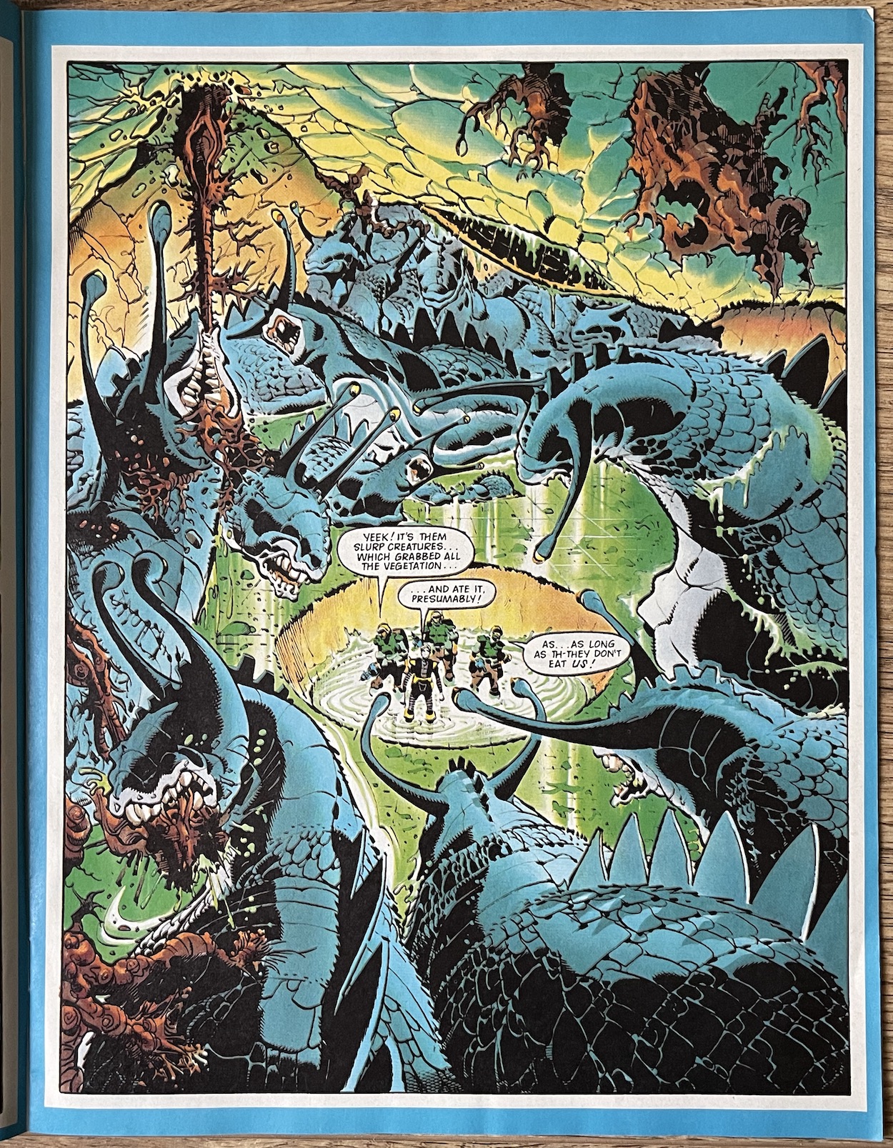 For example, as far as I was concerned Turbo was still languishing on his quest through the Valley of Death, but here we’ve skipped forward to the next chapter in his adventure on the new planet. We find him and his robotic friend Robo accidentally stumbling across two aliens out for blood (or whatever runs through their veins. If they have veins). This isn’t a quick summing up of things either, in the end they realise the two creatures have no interest in our heroes, they have literally stumbled upon this fight. But of course if they don’t defend themselves they’ll go the same way as the loser.