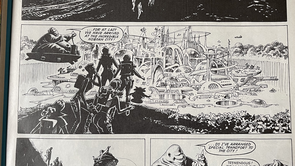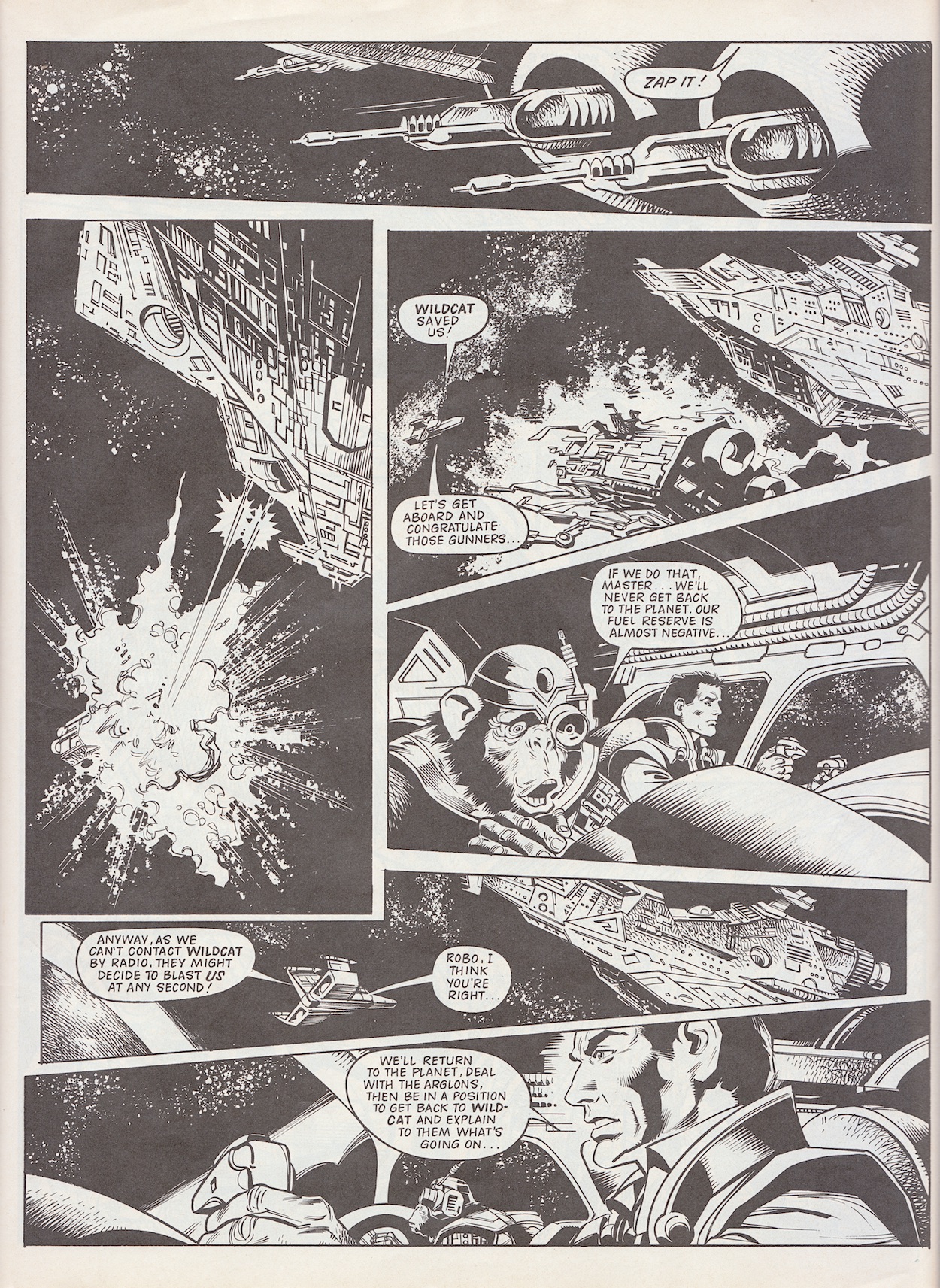 Barrie brought Ian on to design the Wildcat craft and the characters who would lead humanity down to the surface of the planet, and the Wildcat Holiday Special would show some of his original designs. Also make sure to check out his gorgeous full-colour, hand-painted introductory strip for the Ring Raiders Mini-Comic given away free with Eagle.