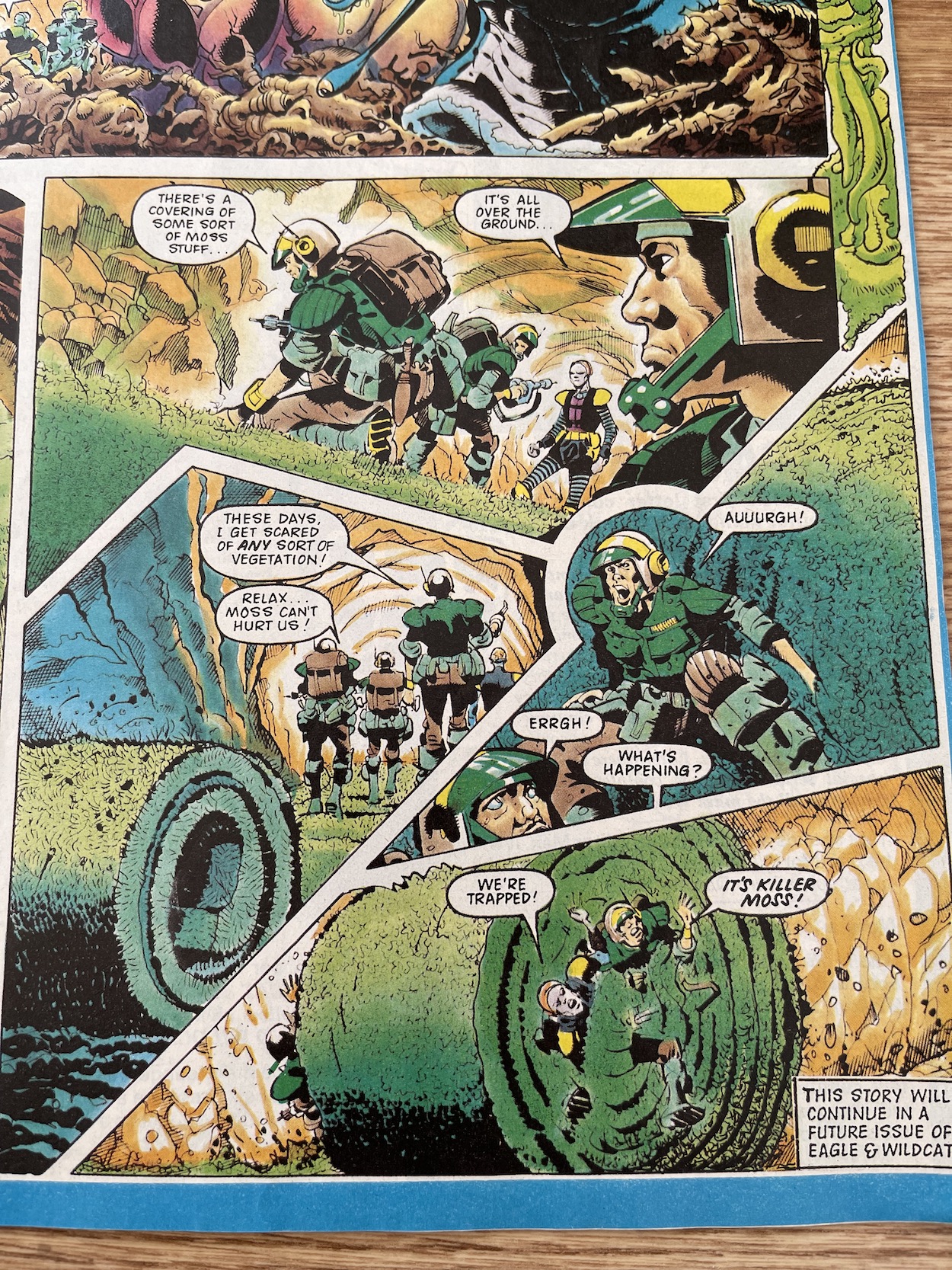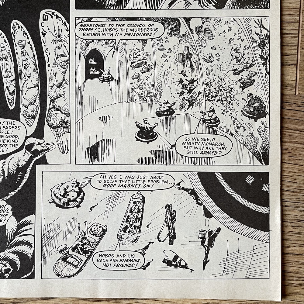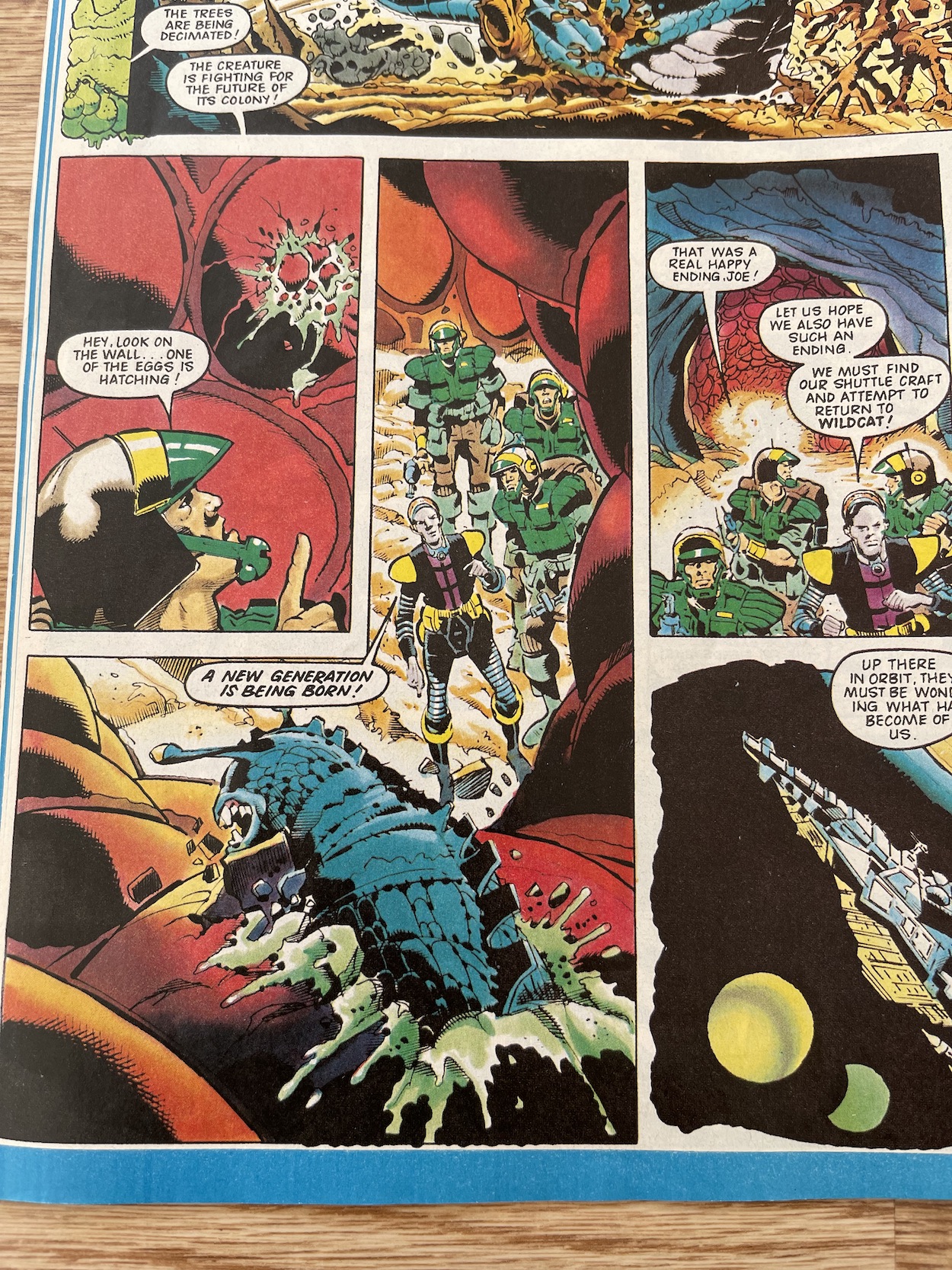 I felt genuinely sad to see the “slurp creatures” die. Even though they’ve only been in the strip for a couple of issues I loved their design and the playfulness with which they first appeared. We were just about to find out more about them too. Their leader was beginning to open a dialogue with Joe and find out why the humans were landing on the planet. I don’t think they’ll be back, but that’s the nature of Wildcat, you can’t get too attached to things, you just don’t know where these stories will go next. With one more chapter to go, and knowing there’s be a wait before Joe appears in the pages of Eagle (which Wildcat merged into), I hope we’re in for a great climax next time, or at least a temporary one.