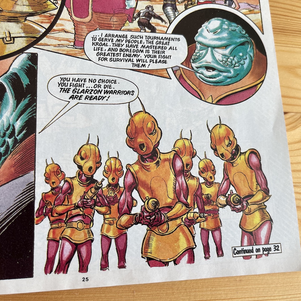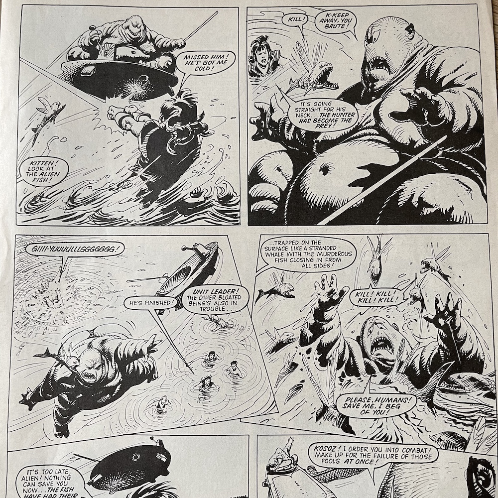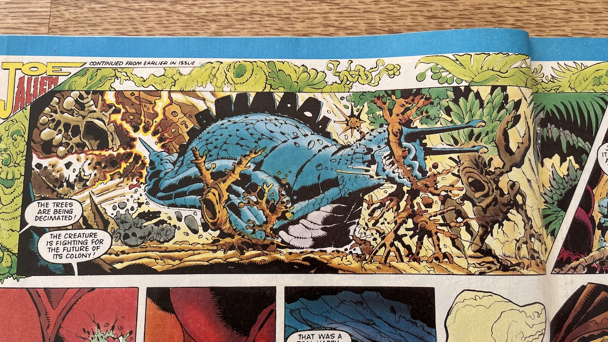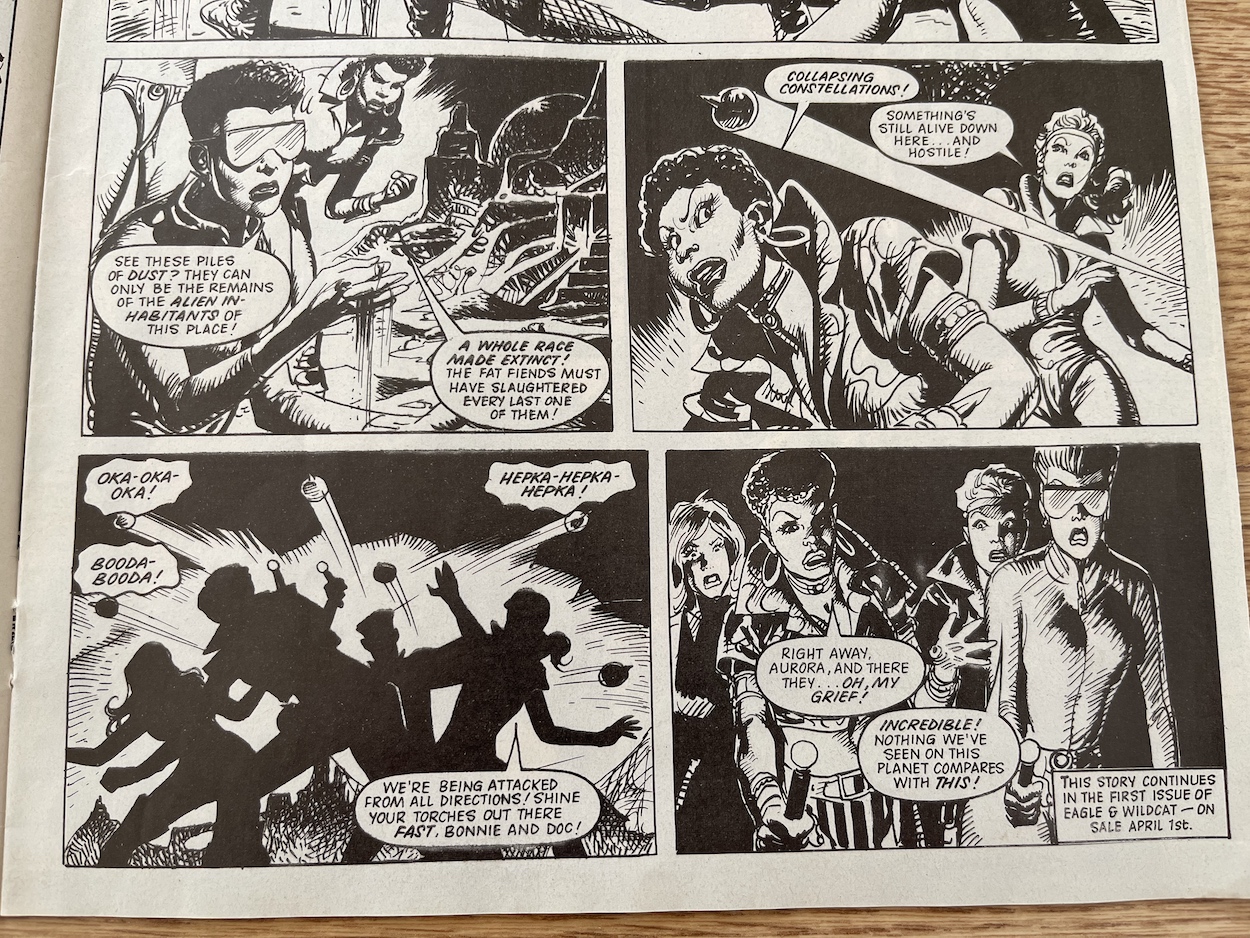 I felt genuinely sad to see the “slurp creatures” die. Even though they’ve only been in the strip for a couple of issues I loved their design and the playfulness with which they first appeared. We were just about to find out more about them too. Their leader was beginning to open a dialogue with Joe and find out why the humans were landing on the planet. I don’t think they’ll be back, but that’s the nature of Wildcat, you can’t get too attached to things, you just don’t know where these stories will go next. With one more chapter to go, and knowing there’s be a wait before Joe appears in the pages of Eagle (which Wildcat merged into), I hope we’re in for a great climax next time, or at least a temporary one.