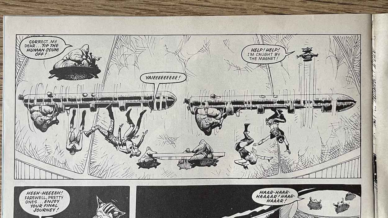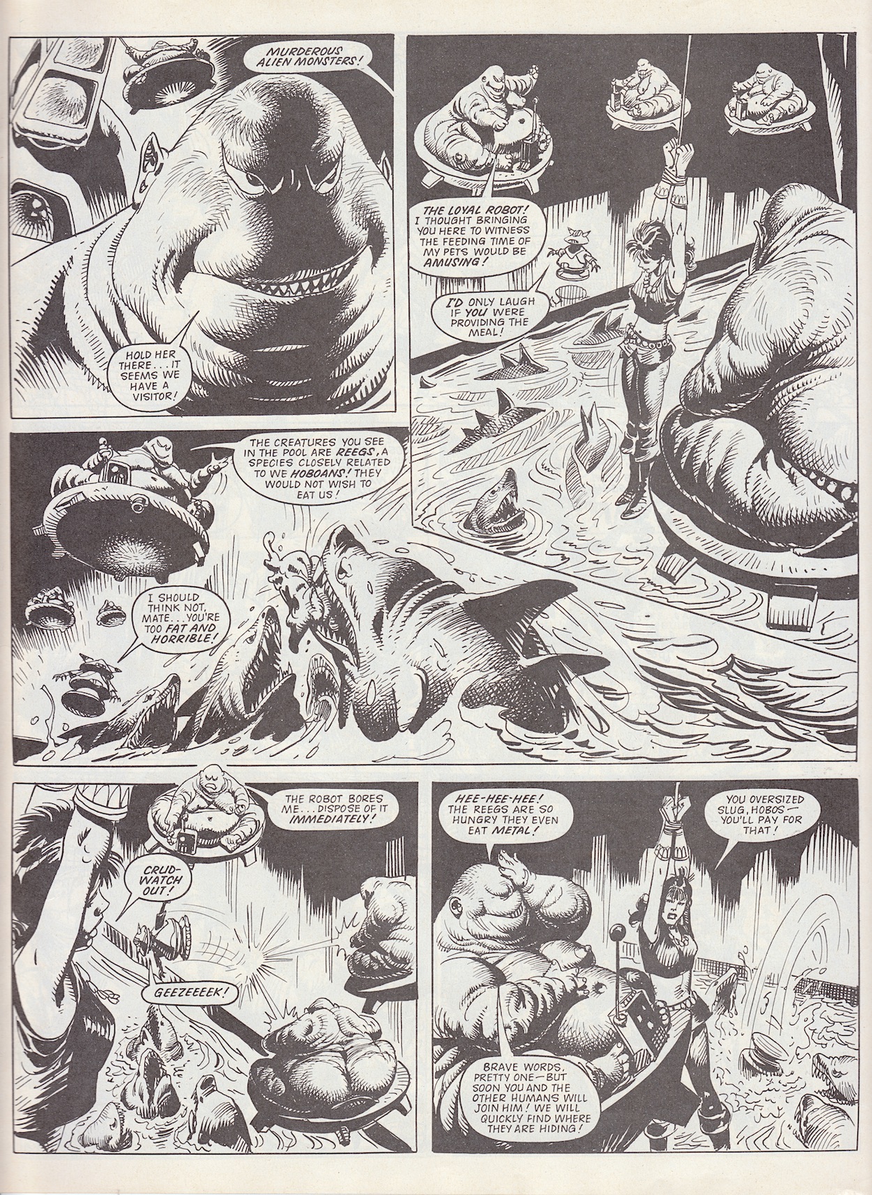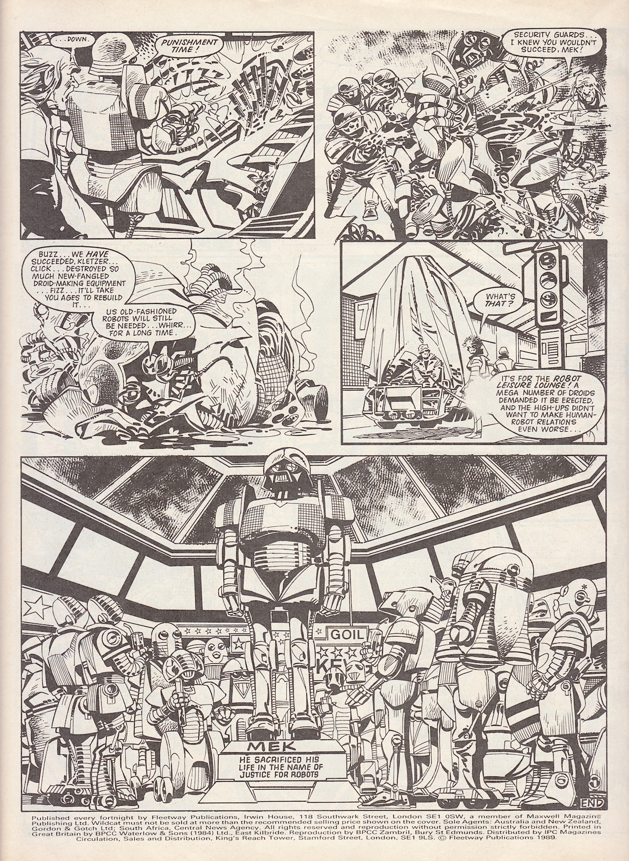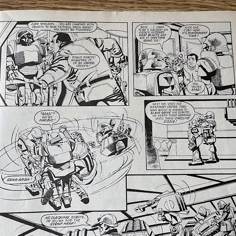 It’s a clear analogy for the class system and it’s unfortunate (but refreshingly realistic in a children’s sci-fi comic) that this far into the future we still face the same problems we do today; it’s not some Star Trek-like utopia. I think this reads even better today as a result. There’s still room for humour amongst the gruesome moments, such as the ever-so-politely-programmed robots apologising to each other as they’re forced to fight, but even then the humour just highlights what’s wrong here. As such, it’s a strip that can produce conflicting responses from the reader and I think that’s the whole point. The robots have been treated so badly we root for them, but their actions are played out like a horror story.