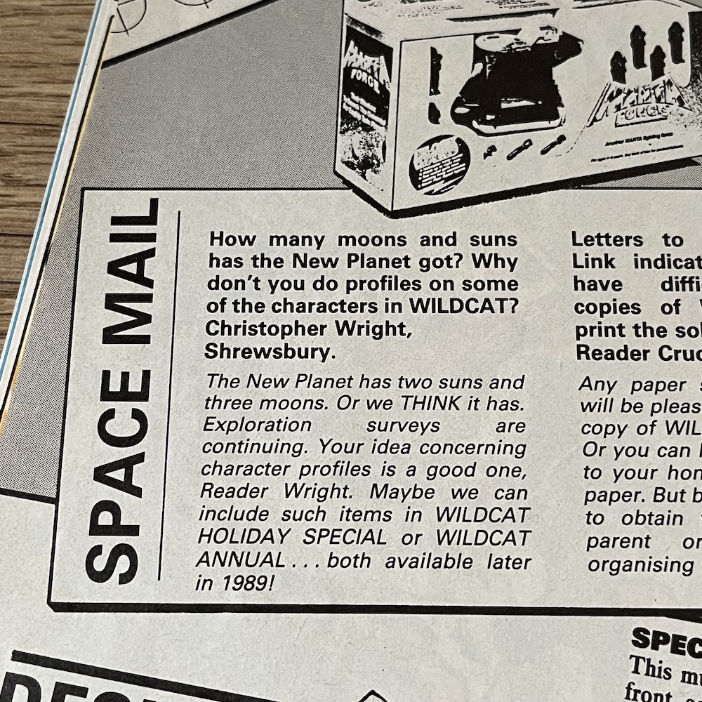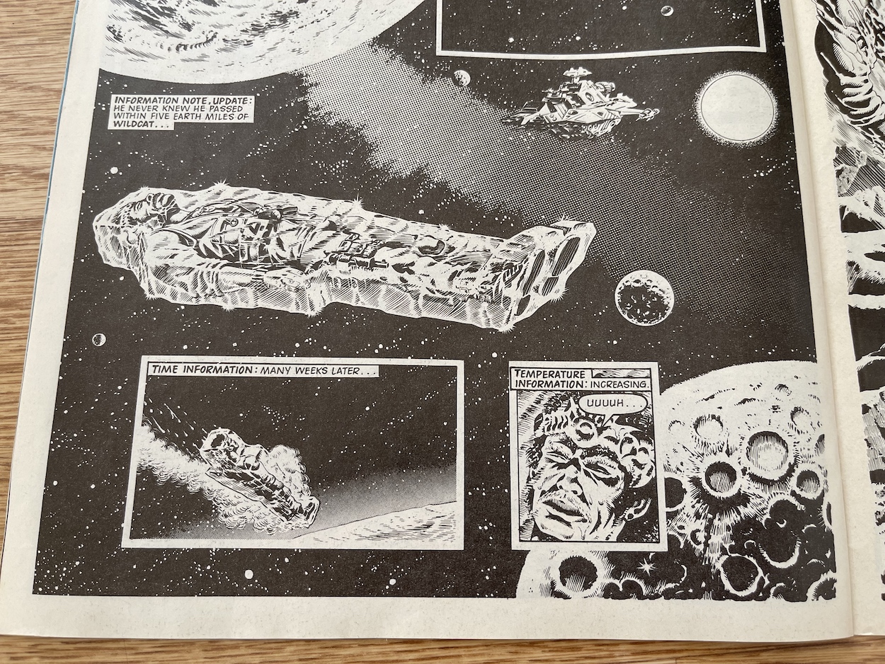 On the Wildcat Time-Warp Data Link pages (letters pages to you and me) the answer to this reader’s question stood out. When asked about possible character profiles in future issues the answer mentions the Holiday Special and an annual. Unfortunately, the twelfth issue would be the last before the comic merged into Eagle but it’s interesting to know even at this stage the fate of the comic may not have been known. The annual didn’t materialise of course, but a Winter Special did, the contents of which I always thought were intended to be in an annual originally. Perhaps this was the case.