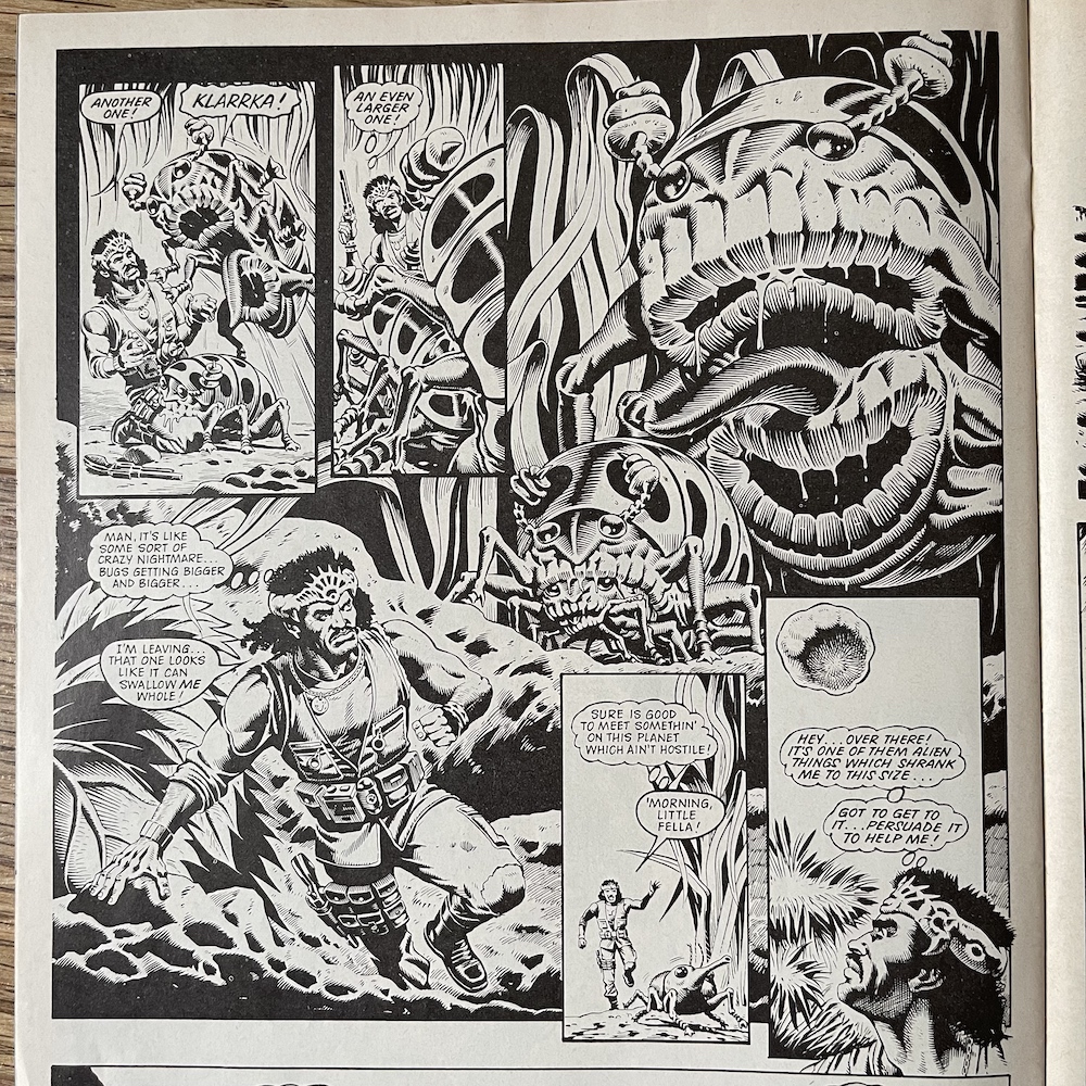 On to Barrie Tomlinson‘s shrunken Loner now and while David Pugh‘s art is always the highlight of an issue, again I feel the story doesn’t really know where it’s going. In this chapter Loner has been attacked by an alien creature that’s clinging to his face, but before he can shoot it with Babe another creature attacks his arm. He’s able to free himself using a rock, hitting the creatures with it and they just pop open, no blood or guts visible. This asks questions, obviously. Then a larger version appears, leaps on one of the smaller ones and begins to eat it, then another larger one appears and does the same to that one, like a vicious family of cannibalistic Russian dolls.