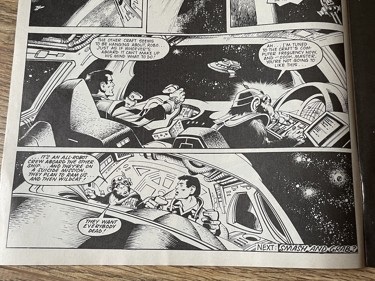 While it has some comical ‘bots, funny nods to the era’s sci-fi and an overall feeling of fun, just like the best Wildcat Completes there’s a dark streak running through the strip. It’s probably more in-your-face here than normal, but perhaps that’s down to the fact I’m a lot older and its symbolism is clear to me now. Let’s also not forget that Wildcat Death Toll either. With four more people added to it our total is 36 so far.