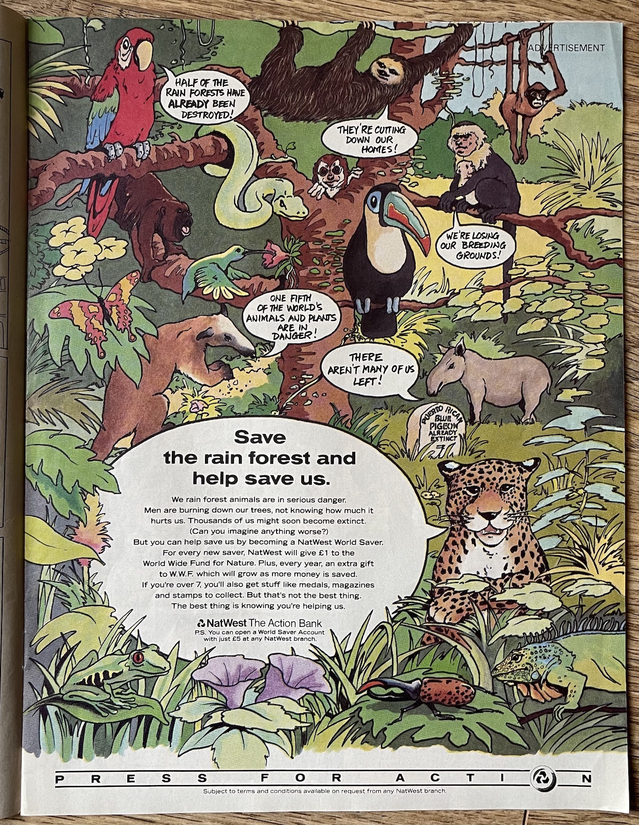 I certainly didn’t find the news special when #12 landed on my lap back then! To round off the issue is an advertisement for the NatWest bank with a central message which is unfortunately just as relevant today as it was in 1989. Finally, the pin up returns to the back cover and it’s Turbo’s deputies Wok and Glune of the Burroids who sign off the comic for its last two weeks.