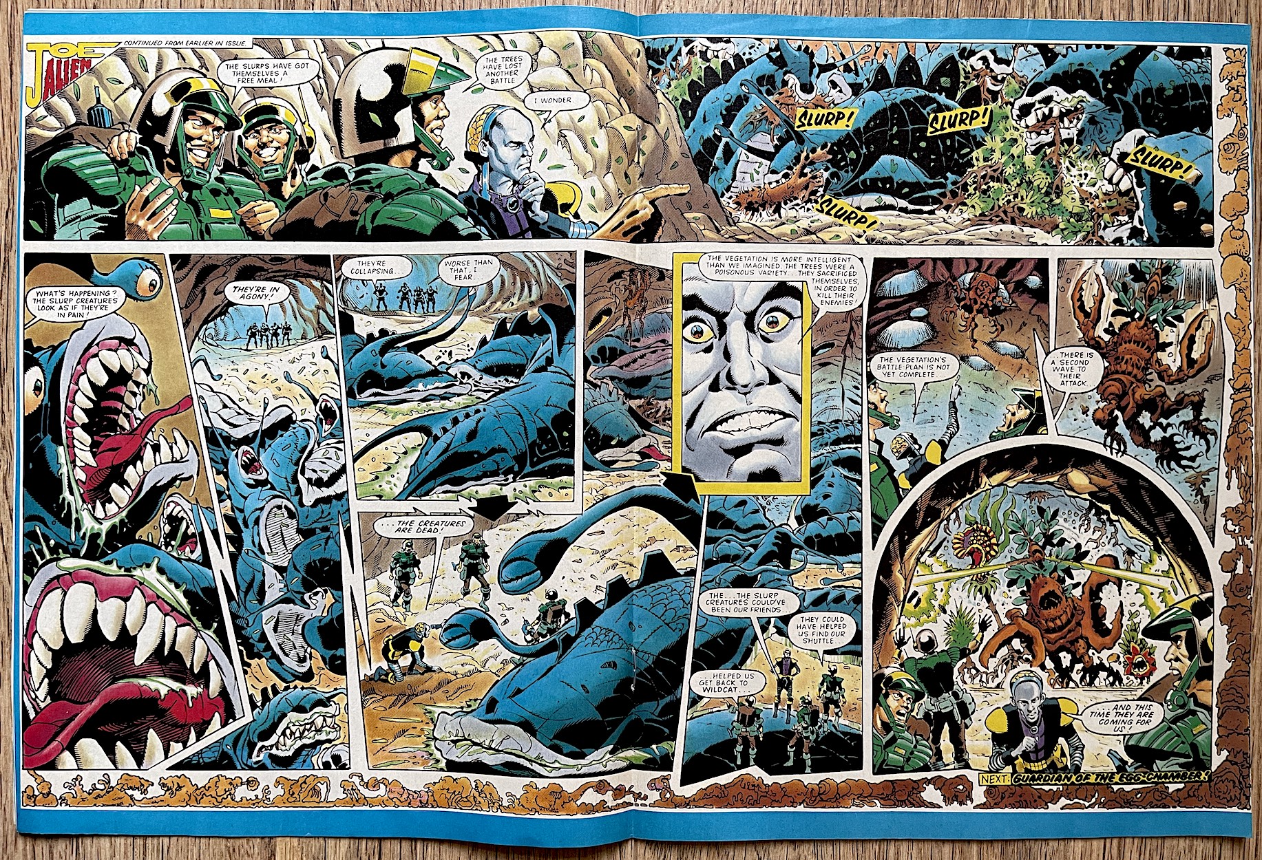 David Robinson‘s Joe Alien is up next and after the shocking conclusion last time (pun very much intended), time flashes forward a couple of hours and he and his team slowly start to come around. Forcing Joe to the ground, one of his men cleans his brain pack and reattaches it. Joe tries to explain to the slug creatures (the Dargonlites, as they introduced themselves last time) but they stop him and tell him they already know why it happened, they’re “not unintelligent beings”, correcting an assumption made just because of their looks and slow nature, again a good lesson for the kids (and adults) reading. Suddenly some tree roots begin to break in above and the slugs attack. It seems like a stupid decision by the vegetation, until we get to our middle pages.