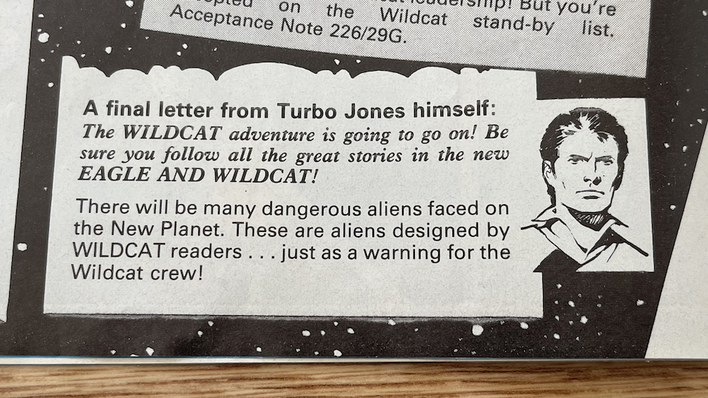 The story would continue in Eagle but readers would have to wait, the little box at the end promising the story will continue in a future issue. As you saw in the promo only Turbo and Kitten would be in the comic to begin with, what with limited space available for the merge. This was another reason I didn’t carry over my comic order. Yes, there’s only so much room for the Wildcat strips and nothing could be done about that, but for young me I only wanted to read about these characters and didn’t like the fact I’d only get a small portion of Wildcat every week.