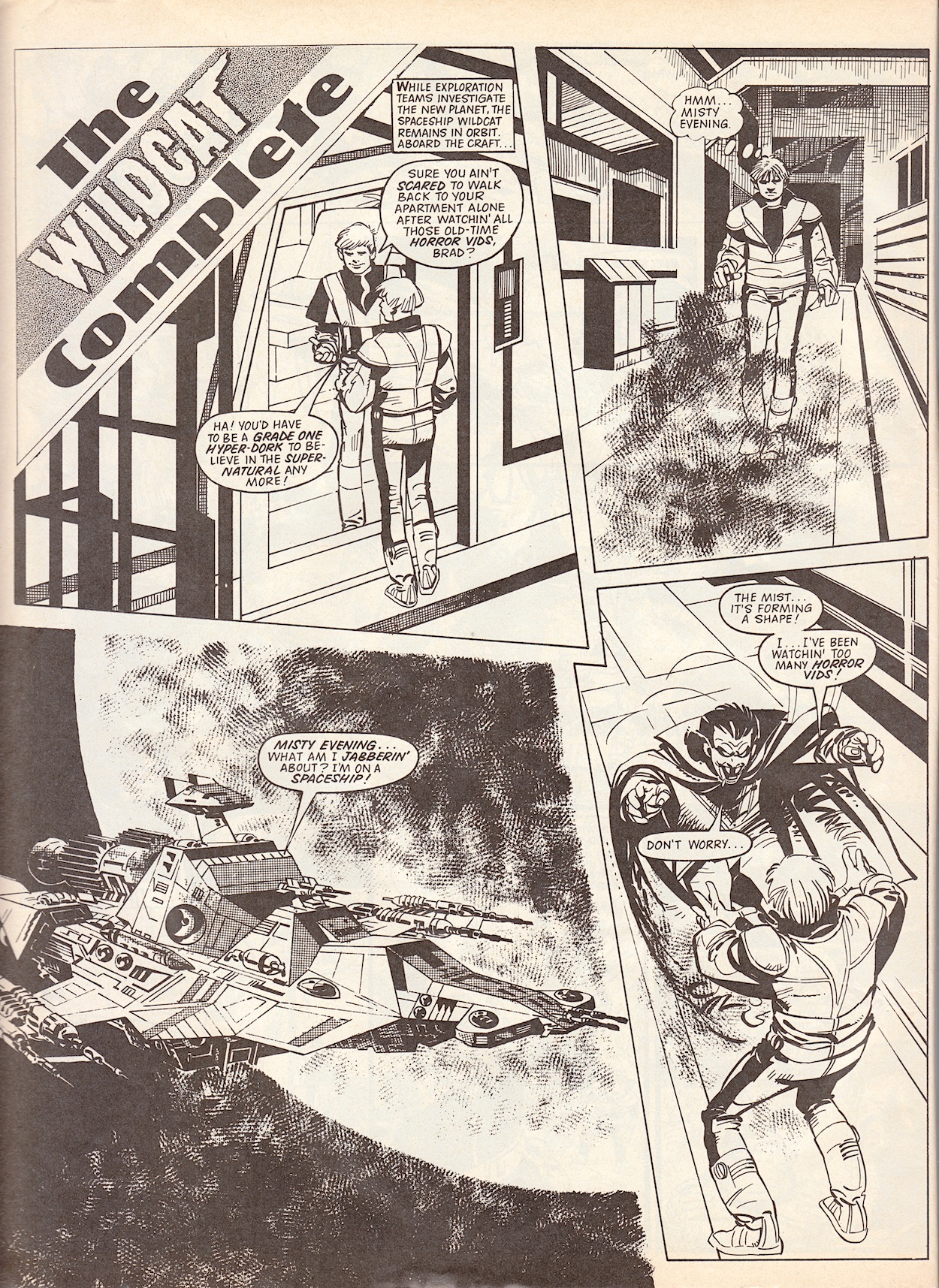 That’s right, we have an actual vampire onboard. There’s also plenty of well-judged humour here too so it’s unfortunate we don’t know who wrote the script. Here on the first page the casual thoughts of our victim raise a laugh as he catches himself on about the “misty evening” before meeting his end, and later on as another victim is running late in getting home he thinks to himself how he’ll “get it in the neck” from his wife! These are the only people we see die (taking the Wildcat Death Toll up to 40) but mention is made of them being only the latest in a series of disappearances, so our toll is actually unknown.