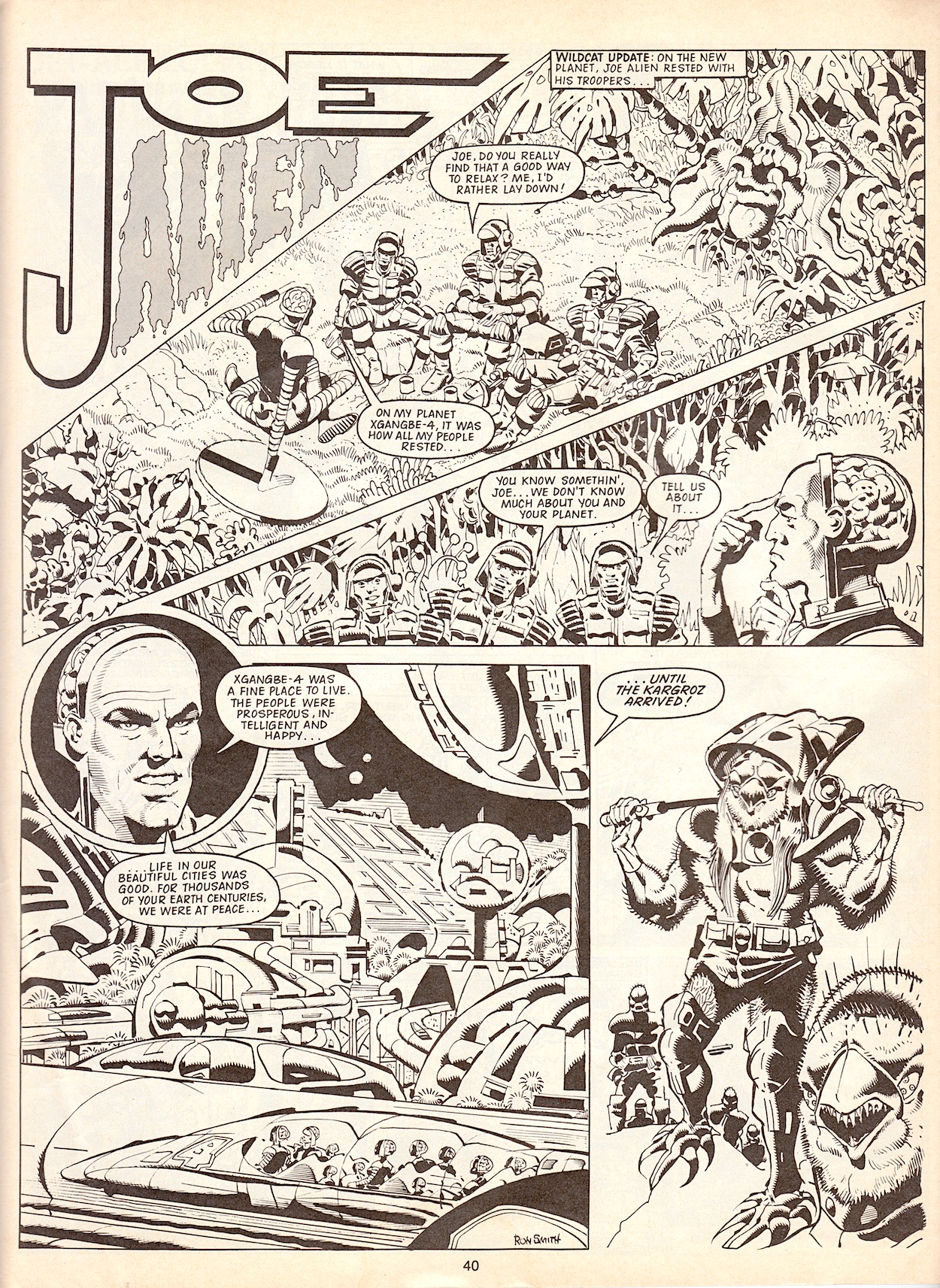 Before a very special ending to the issue there’s one more strip to read. Wildcat fans will know that must mean it’s time for David Robinson‘s Joe Alien, although not in his usual full-colour format which is a shame (in fact apart from the pin ups and a readers’ drawing spread the whole issue is black and white) but Ron Smith’s artwork still shines. The strip itself finally gives us some background information on the interesting character and how he ended up as the last of his race. In fact, for fans of his this was a hugely important strip!