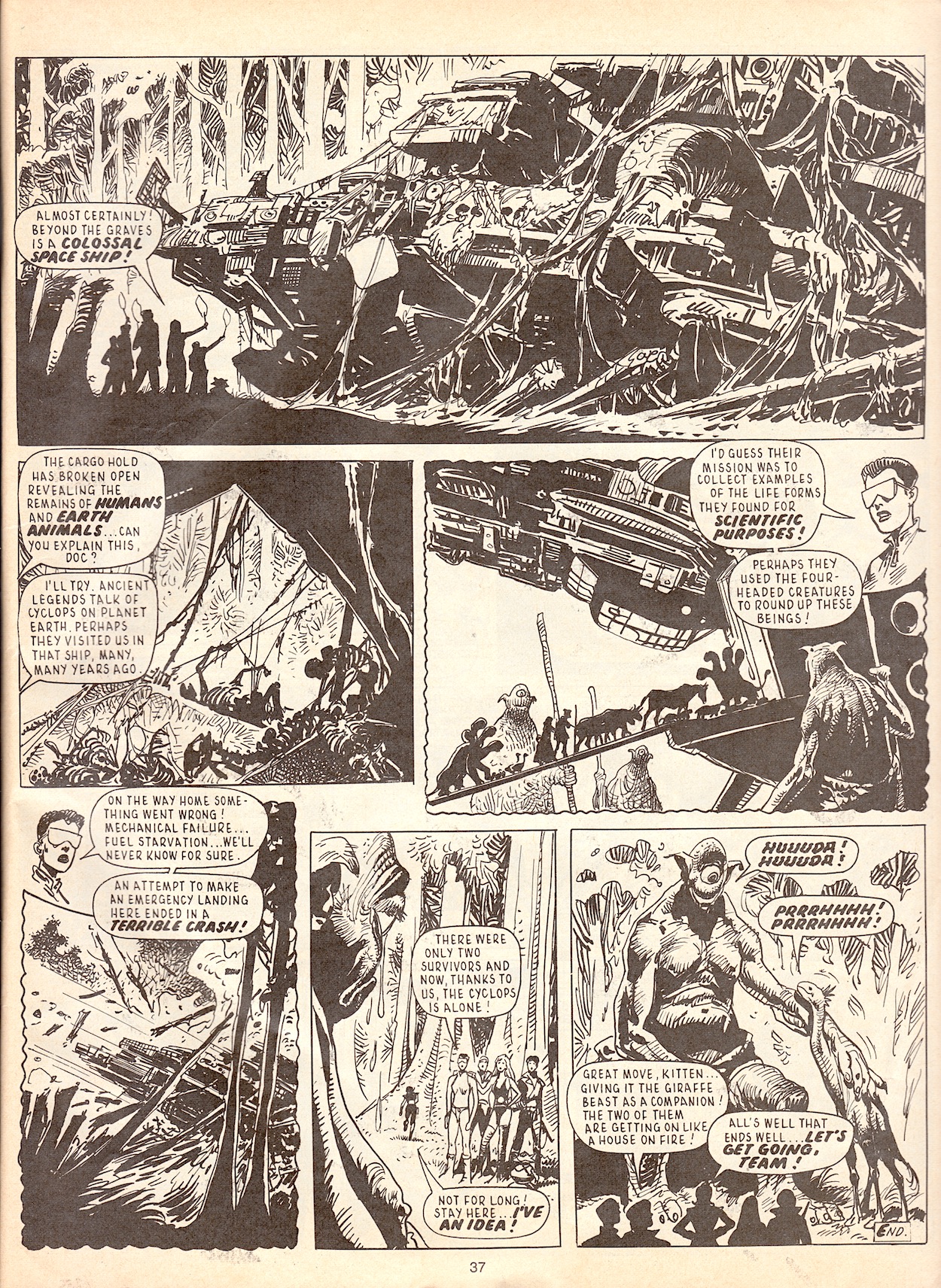 It’s important for me to note here that at the beginning of the strip the team had captured a docile kind-of-giraffe animal for study by Doc. You’ll see below how that comes back right at the end. This story contains hints at the world building Wildcat could have achieved if it had carried on for years to come. We had some in the twelve regular issues but of course everything was still in its early stages of development. We can only imagine the epic, overarching stories editor Barrie Tomlinson and his team could’ve concocted over time.