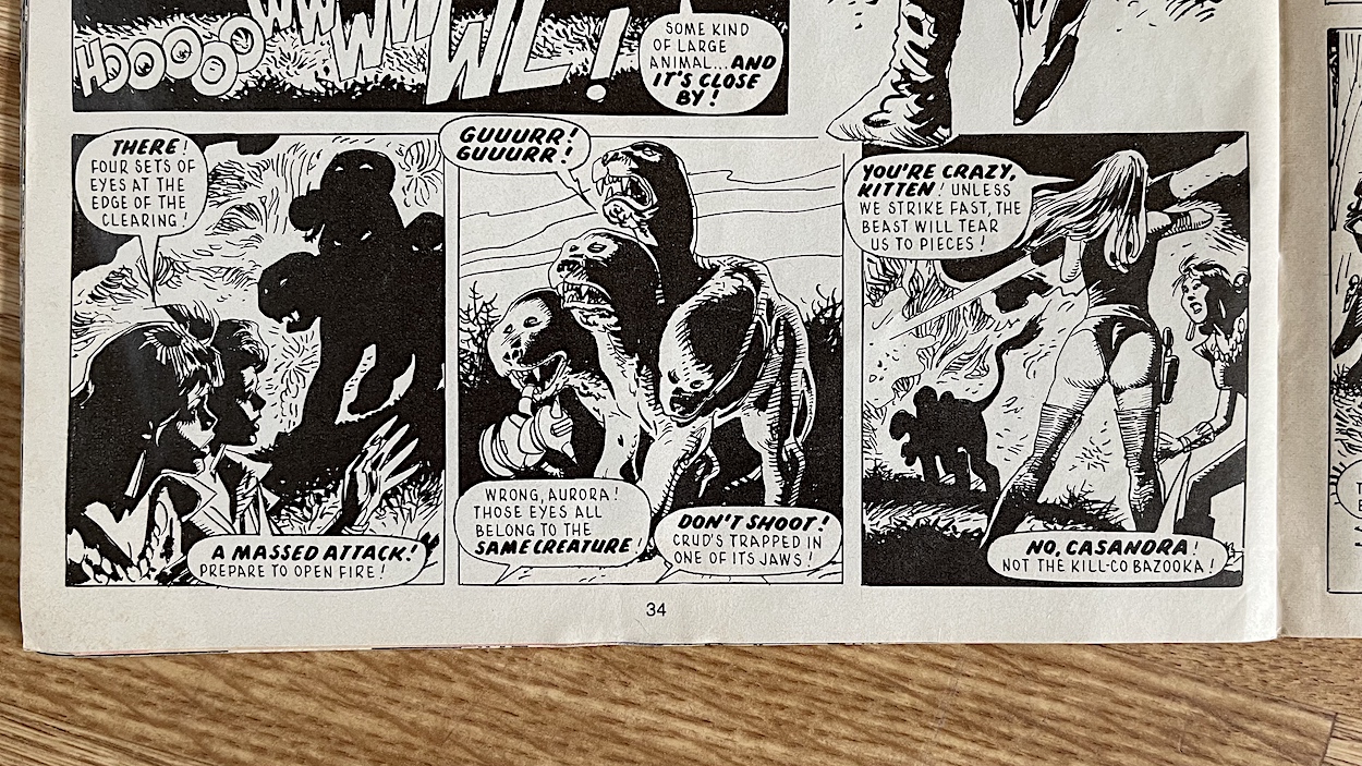 In Kitten’s regular story she and her teammates would come up against a never ending array of imaginative alien creatures, each one displaying some kind of innovative ability that they’d have to outthink on the fly in order to survive. From monsters with heads for hands, to gigantic leviathans with multi-headed pet dogs and beasts with see-through stomachs. The Kitten Magee strip also had strong ongoing stories and mysterious character arcs, however a big part of the fun was seeing what kind of monster would be thought up next.