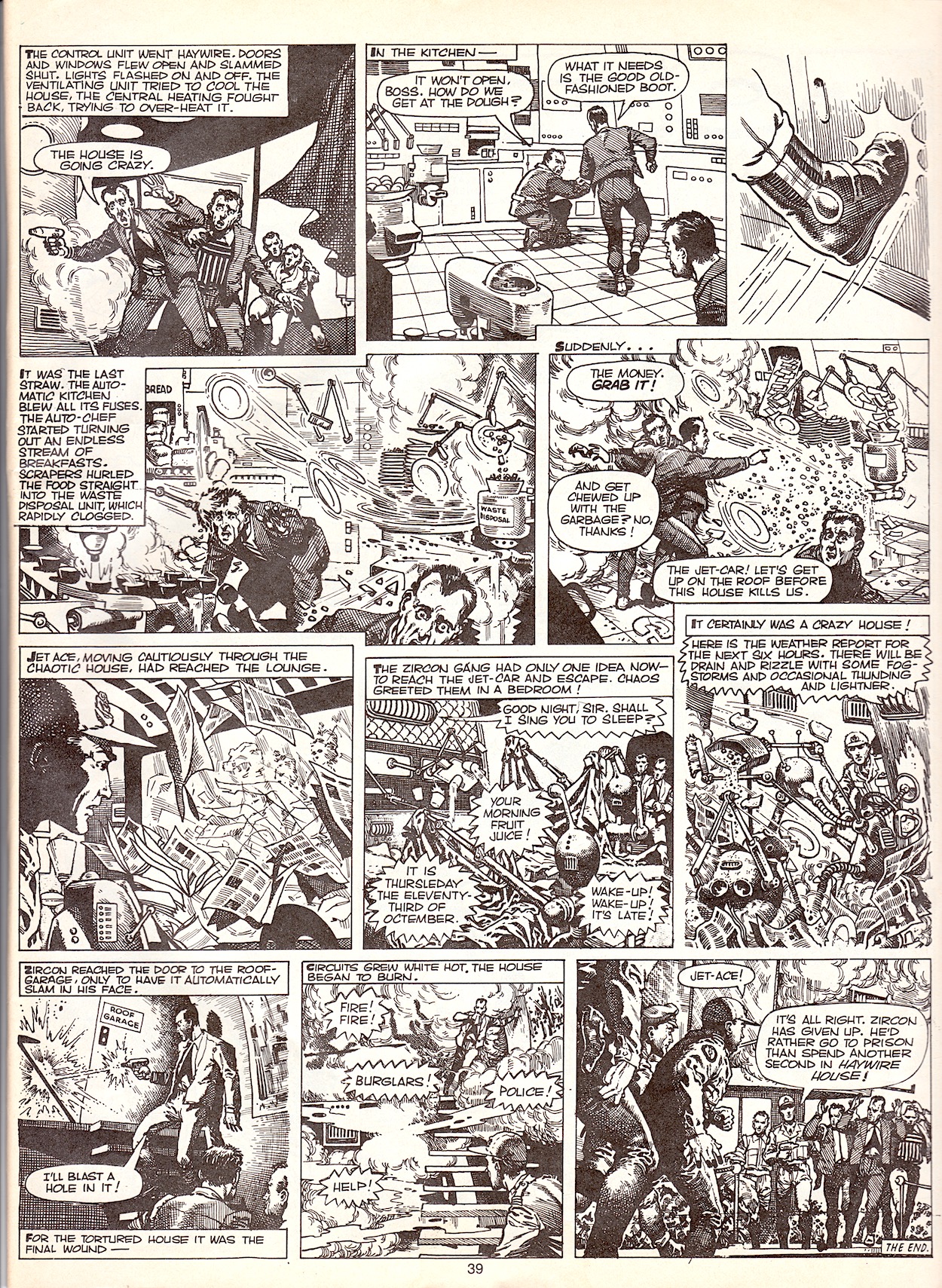Four pages within this special are made up of a Tiger comic reprint called Jet-Ace Logan, a pilot who works for the futuristic interplanetary C.I.D. approximately 100 years in the future. Two stories are included here, two pages apiece and the one I wanted to show is called Haywire House. A modern home exhibition is about to be robbed and Logan stops the burglars in their tracks in a suitably ingenious way. I particularly like the art by Brian Lewis (Eagle, TV Action, Countdown), with so much of it crammed on to the page and jam-packed with details, all without losing any of its clarity.