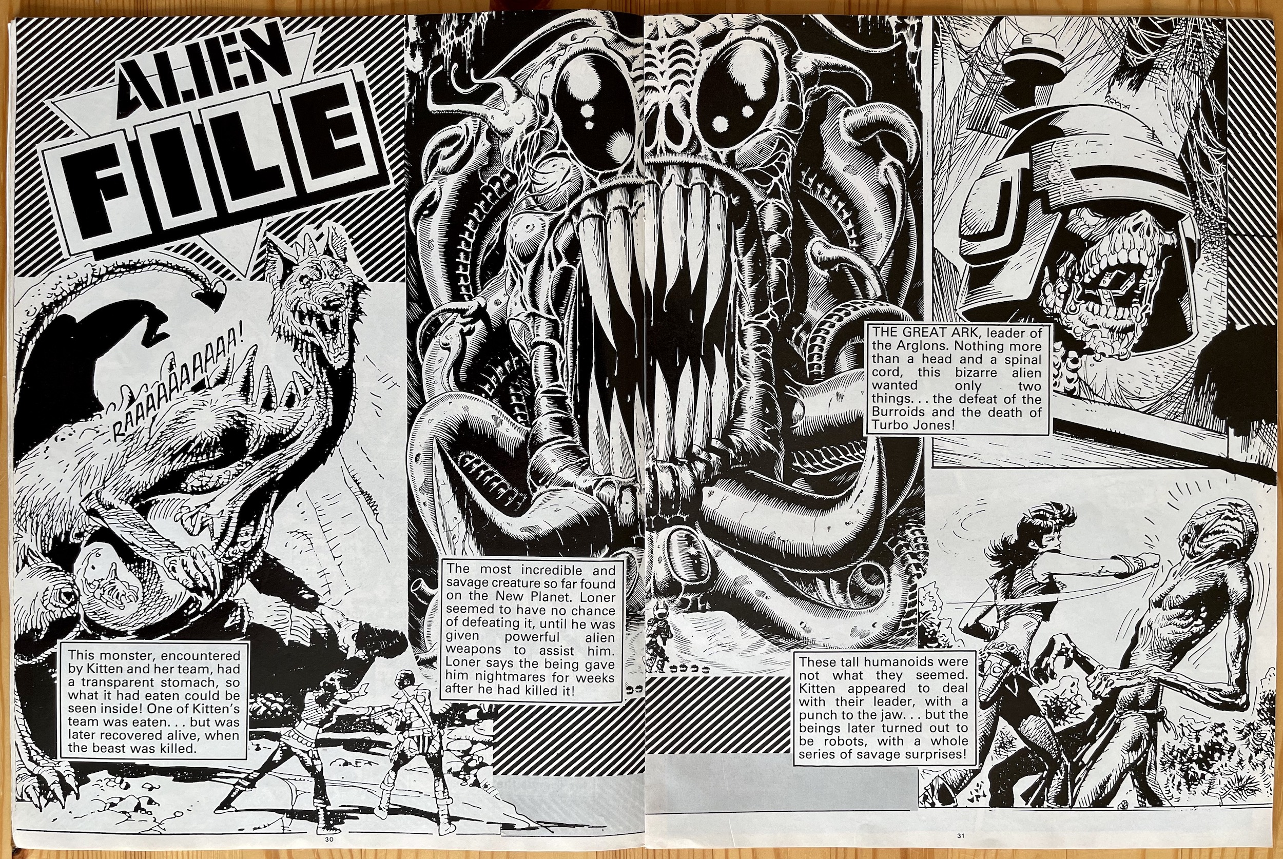On top of all this we get a Loner story written by editor Barrie Tomlinson, however it’s told in prose with images of David’s taken from the regular comic. At five pages and full of text it’s a meatier read than I expected and actually a whole lot better than the strip we’d been reading for the last handful of issues. Falling into a chasm he’s apparently rescued by an alien slug creature who carries him to a large cave full of slugs where he also sees another, two-headed alien. They have to fight to the death for the entertainment of the slugs! (Are they an unfriendly relation of the Dargonlites from the Joe Alien story?)