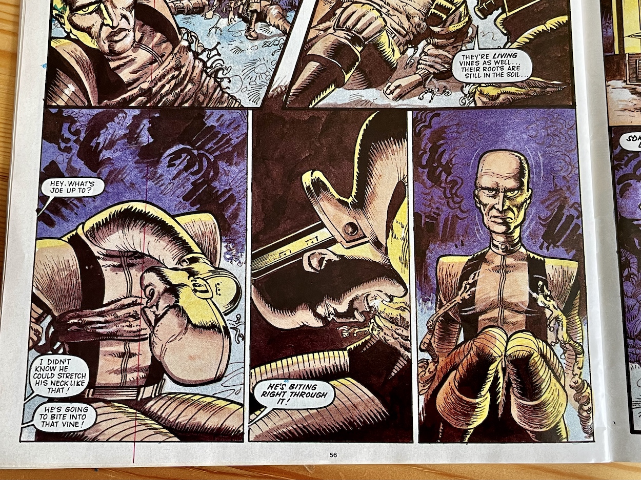 The second half of the issue has a full colour Joe Alien story split up into little two-page pieces just like The Games. While David Robinson‘s story isn’t technically a reused one, it does set itself neatly into the serial from the fortnightly, seeing as how Joe and his team were captured by the alien plant life on more than one occasion. Basically, they get captured again, Joe’s brain becomes disconnected again, then they escape again. But I find it strangely enjoyable.
