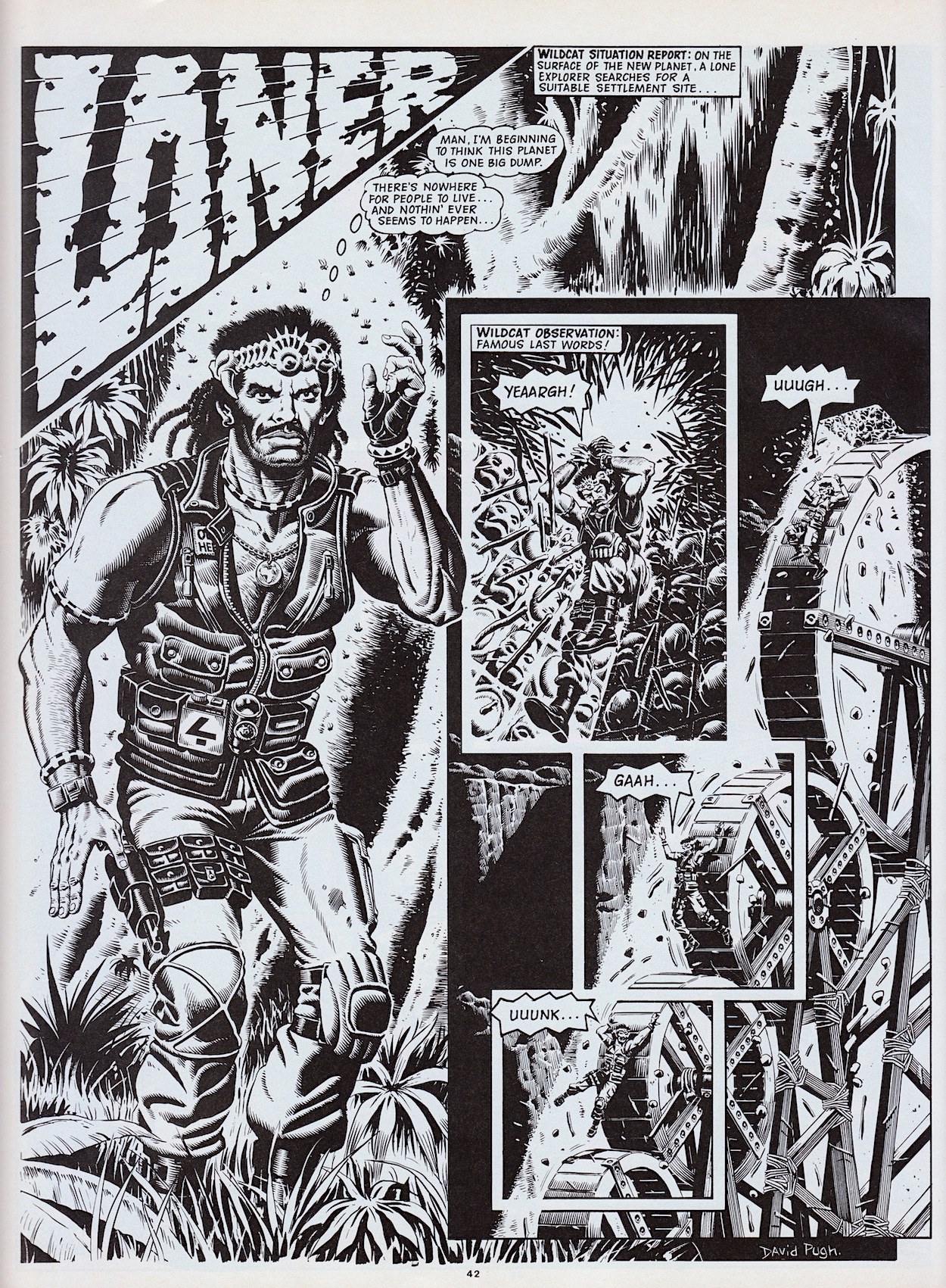Ah yes, that does look lovely, doesn’t it? Welcome back Loner! Regular blog readers will know he was my favourite character in Wildcat and his first adventure was absolutely riveting. Unfortunately his second was less so, but here we’ve got a brand new one-off tale of him exploring the planet’s surface and once again he’s fallen into some trouble. I do like the way the sequence of him falling down that wheel mechanism is shown through clever use of a main panel and some smaller ones overlaid on top.