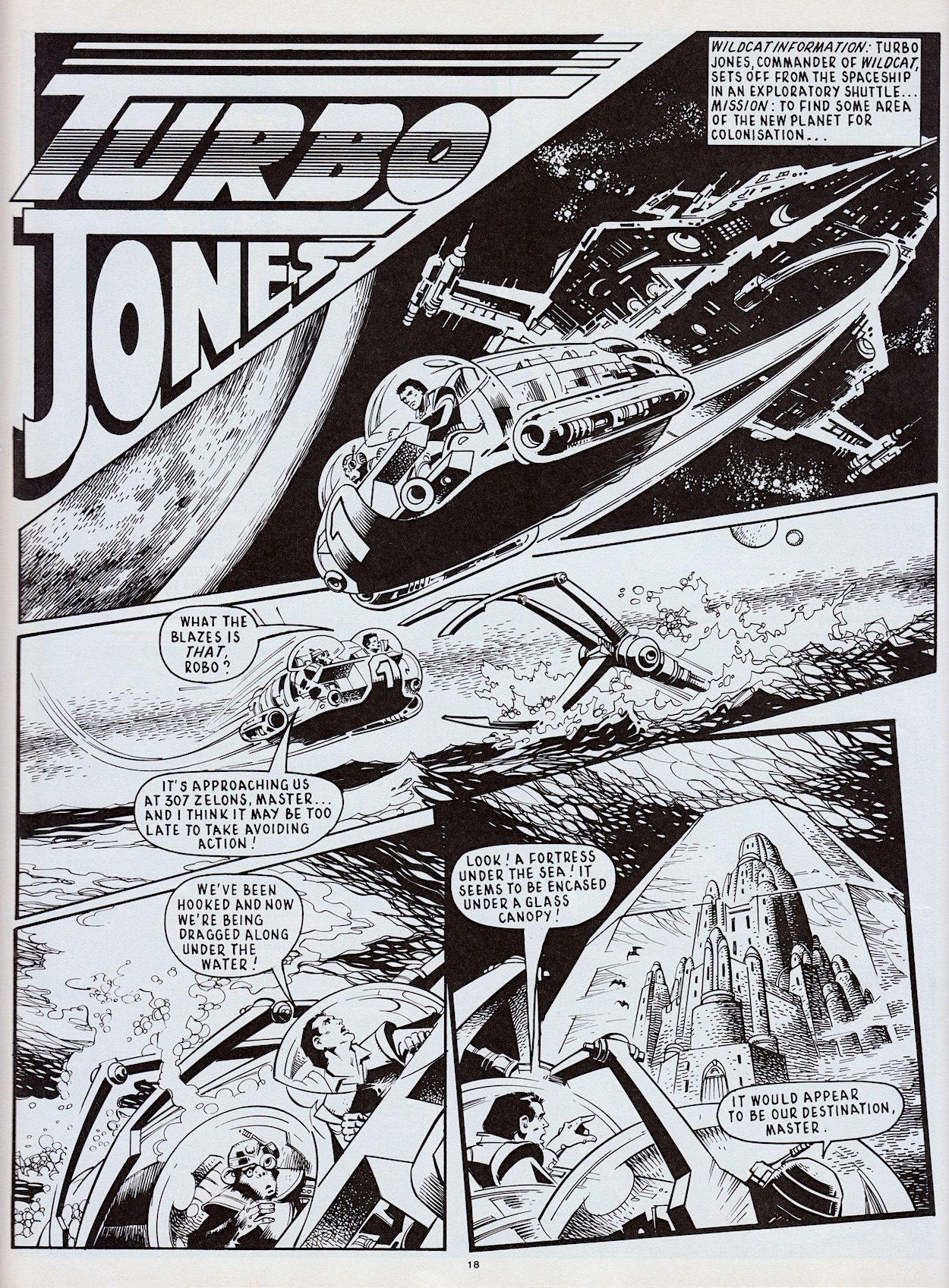 First up is Turbo Jones who by this point feels like a completely different character to that in the preview’s reprint, such was his character development. Off on another mission illustrated by Vanyo, set some time after his first adventure, he and Robo are plucked from the air and dragged underwater by a mad alien who forces them to help him. One thing that immediately stands out here is the amount of story crammed into the six pages it takes up. It’s like the exact opposite of The Games.