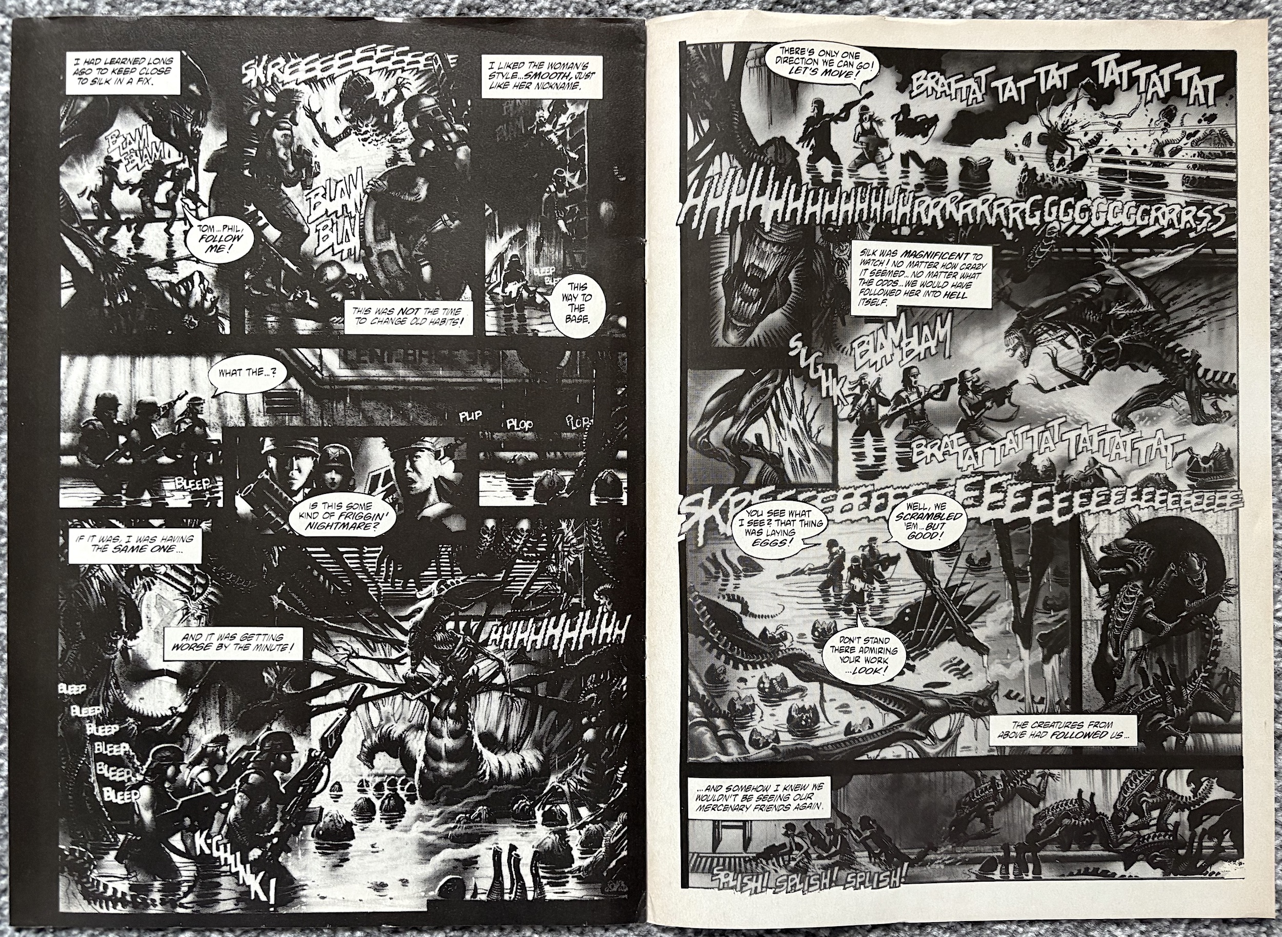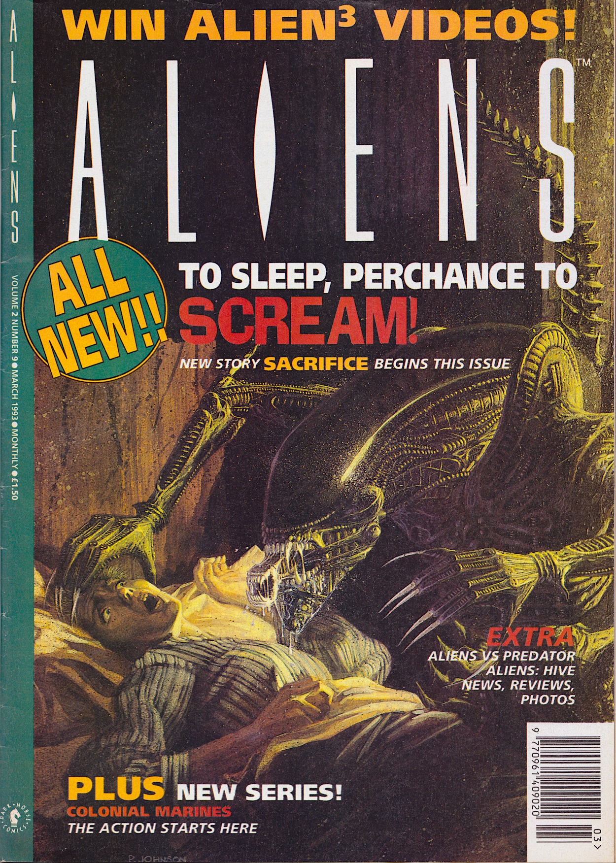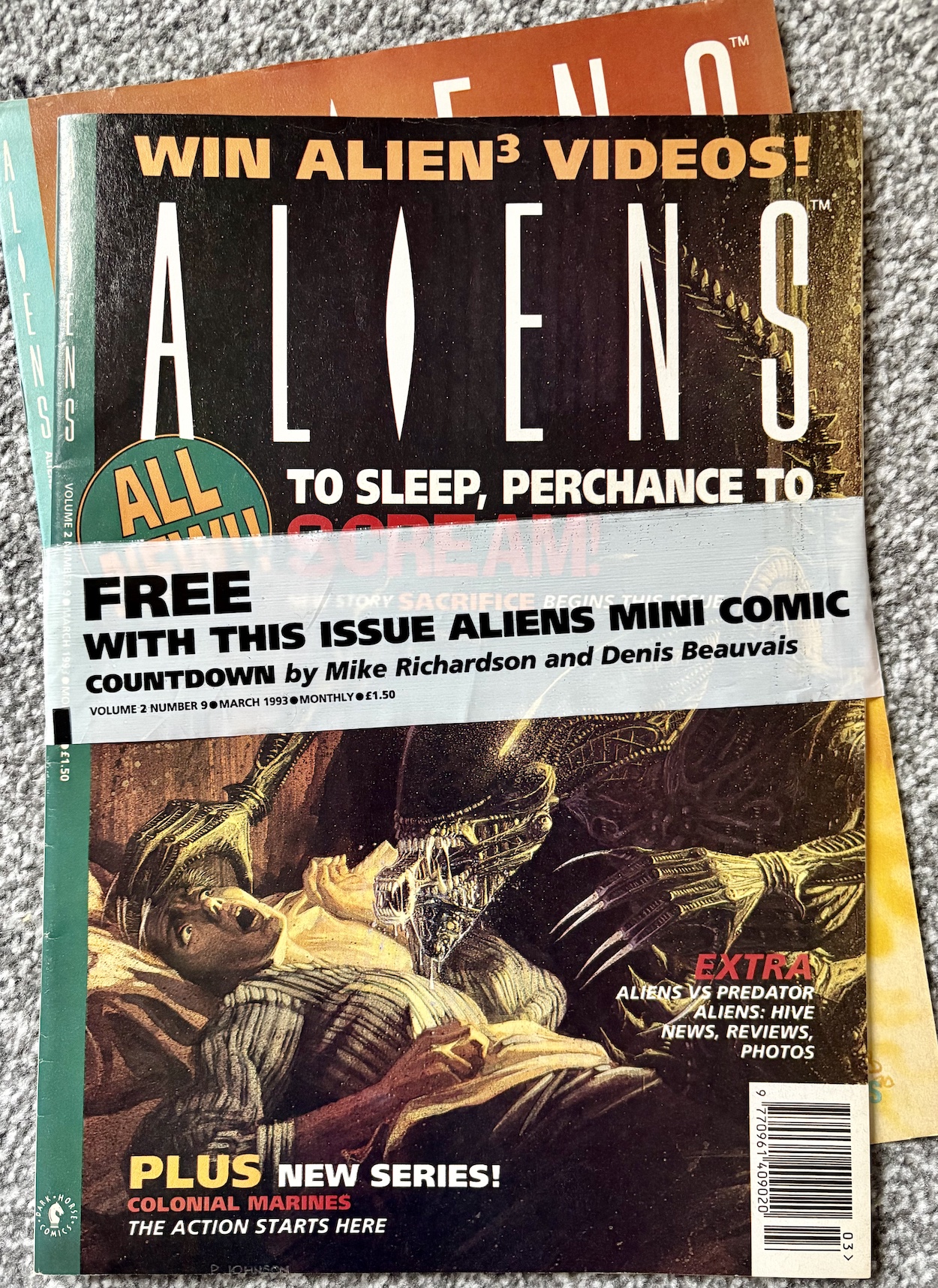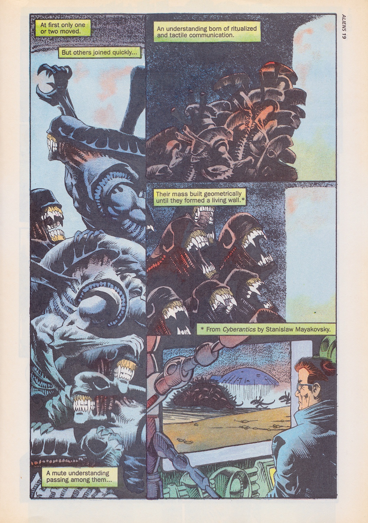 I’ve been excited for this ninth issue of Dark Horse International’s flagship Aliens comic for a few reasons. First up, it includes the free gift mini-comic, a rare treat when buying classic comics. Secondly, Hive finally comes to its long overdue conclusion. Thirdly, the epic Colonial Marines strip I remember from the one issue I bought as a teenager begins. But there’s something else above and beyond all of that.