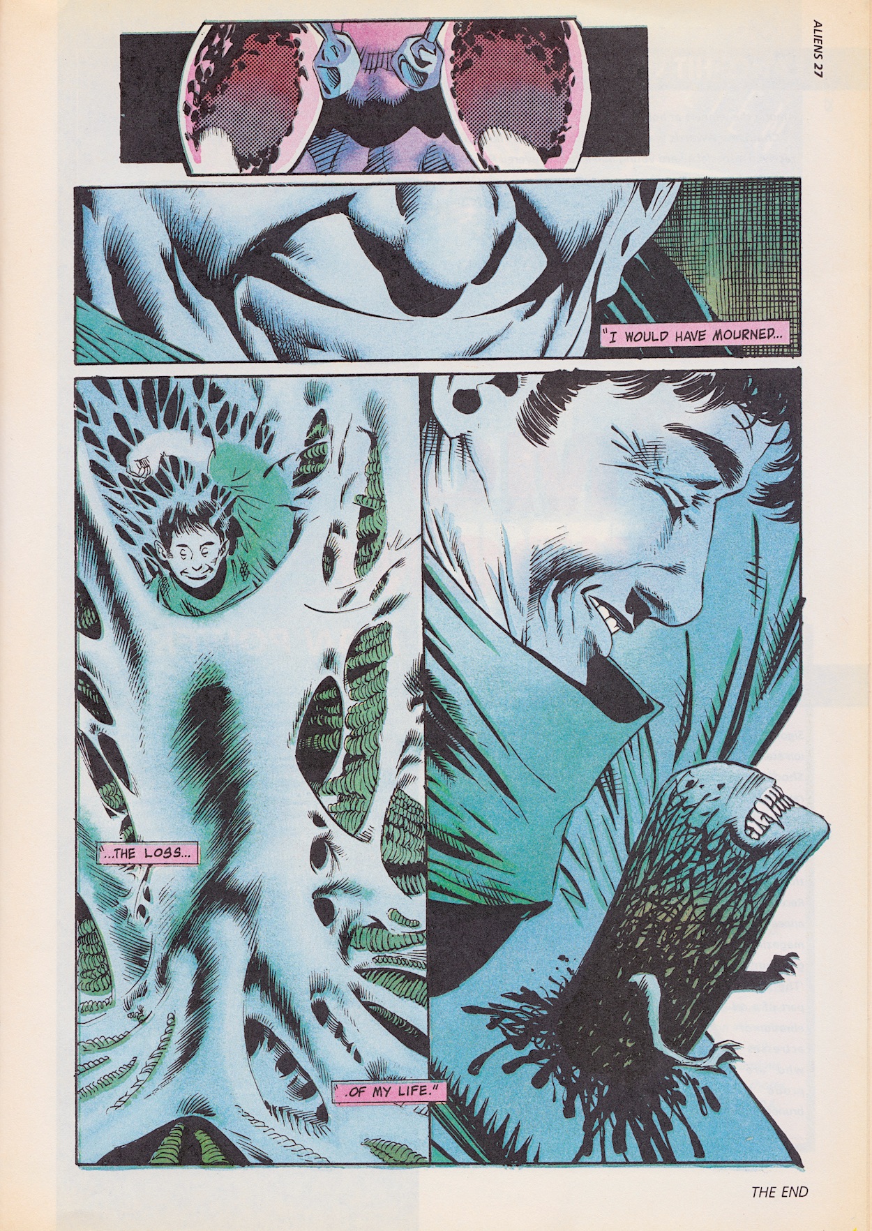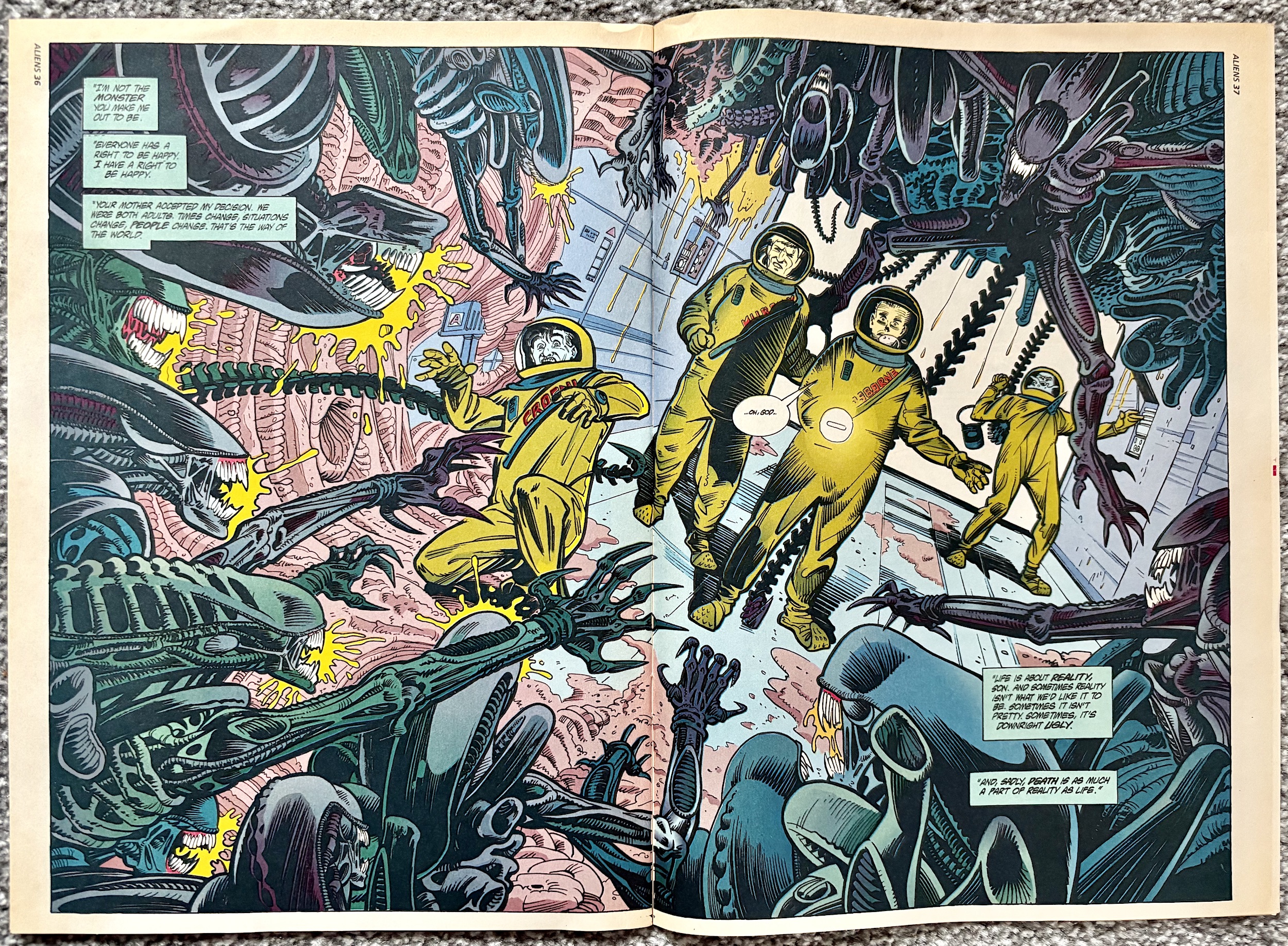 I remember not being a fan of this art style at the time in a friend’s 2000AD but it’s grown on me in the years since. Back then I didn’t like the lack of inked outlines and sometimes found them hard to follow, but now I think they look glorious. For Aliens, artist Paul Johnson is a very welcome addition to the inside of the comic after his previous covers for #2 and #3 (and this issue’s is his too).