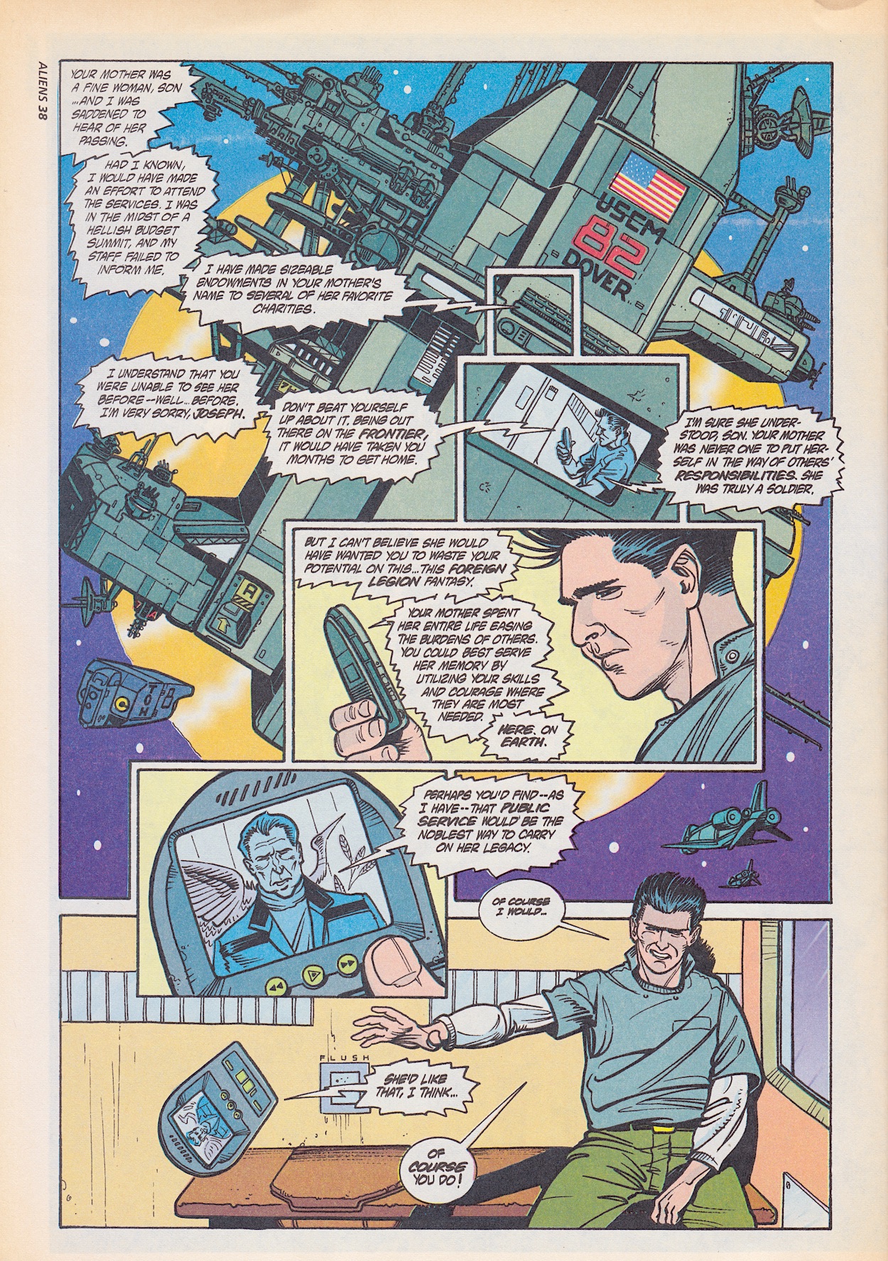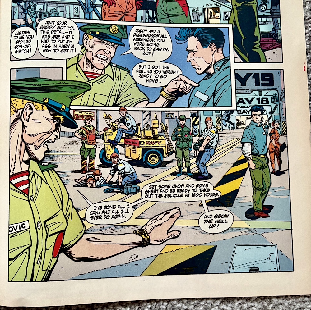 Elsewhere, Lt. Joseph Henry of the Colonial Marines is in trouble for striking a captain. Despite the fact the captain had been beating up a young female prostitute, only Joseph is in trouble. Recently his mum had died and because he was so far away in deep space he couldn’t be with her in her final hours, nor was his powerful military father who chose the job over her. The fact she died alone is eating away at Joseph, so I can’t blame him for punching the captain given what he was doing! In fact, I like him already.