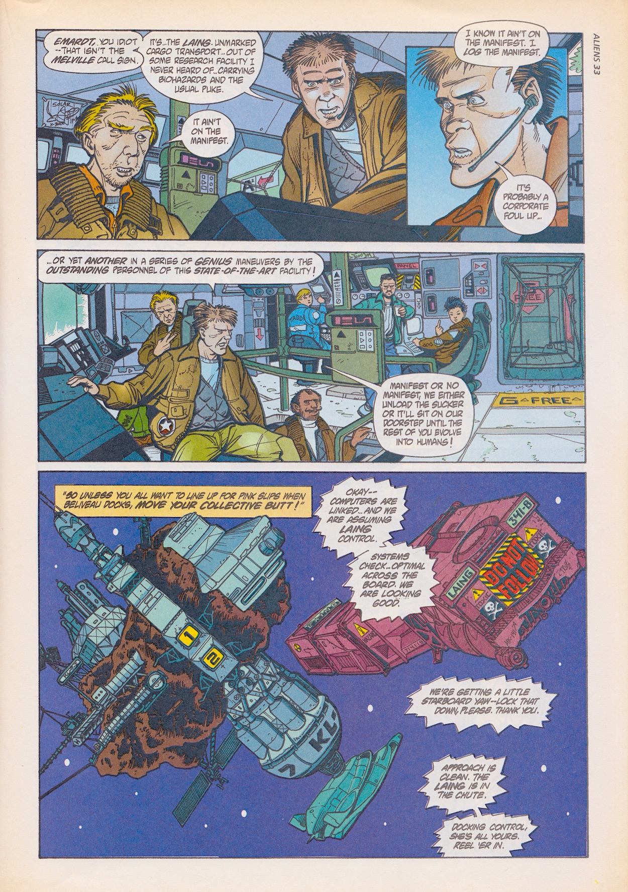 His punishment sets up our story. Ordered to fly a team of replacement workers to an unfinished communications array in deep space, he’ll stay with them for a full year. So that’s an area of space where they can’t call for help, then. Plot point one established. But first he has to drop off a company executive to something called a ‘Sungun’ where an inspection is due to take place. Plot point two established. So exactly how are things going at the Sungun where they’d just docked the unmanned ship? Let penciller Tony Atkins (Terminator, Wonder Woman, Fables), inker Paul Guinan (Boilerplate, Chronos, Barb Wire) and colourist Matt Hollingsworth (Preacher, Catwoman, Death: The High Cost of Living) fill us in.