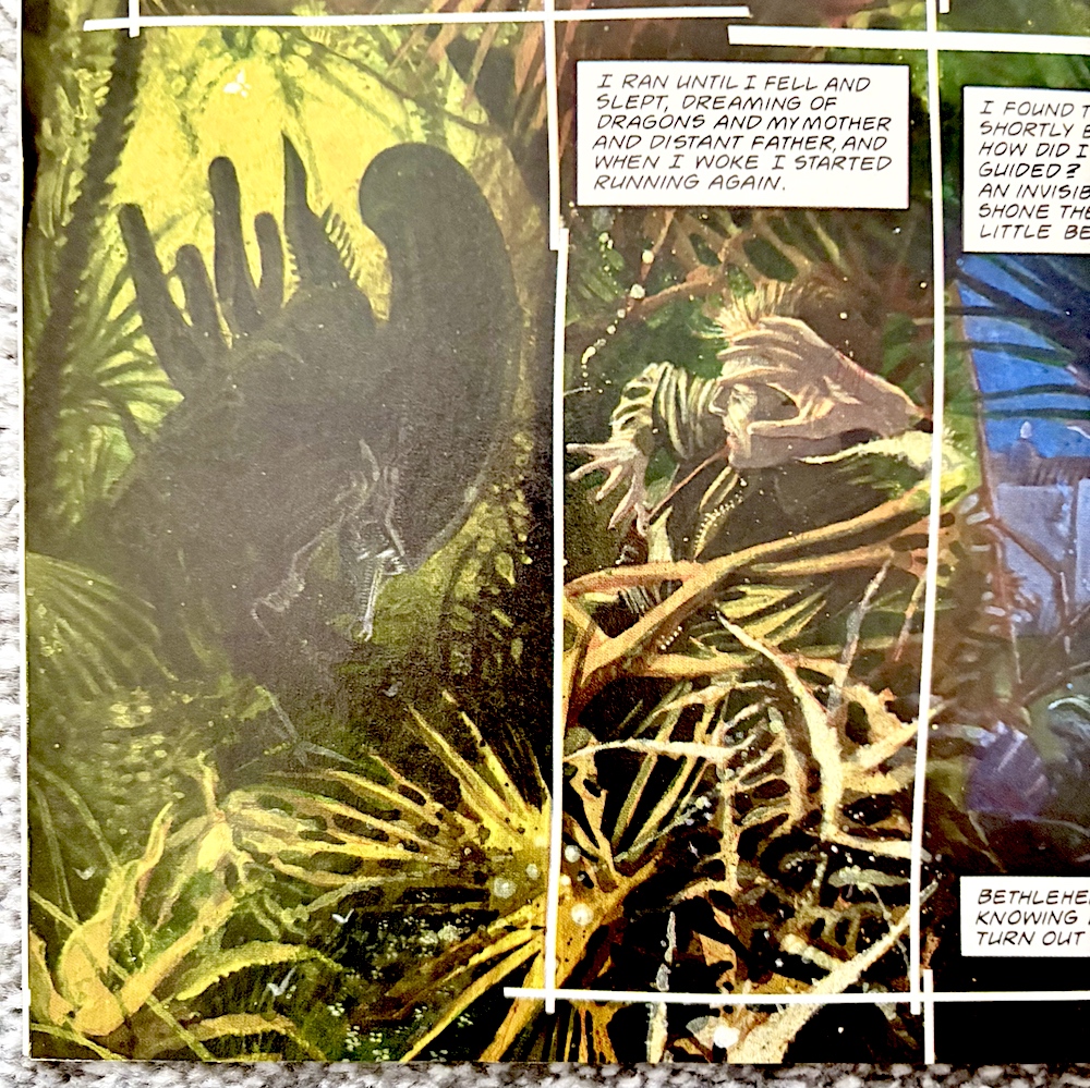 The characters might be clichéd (we even see a nighttime scene of the villagers heading to the altars by torchlight carrying something that looks suspiciously like a baby) and the dialogue is stilted, but the art is superb and there’s an atmosphere and a mystery about it that intrigues me. Perhaps the alien just can’t get into the settlement and the sacrifices made are in vain? But why didn’t it chase Ann?