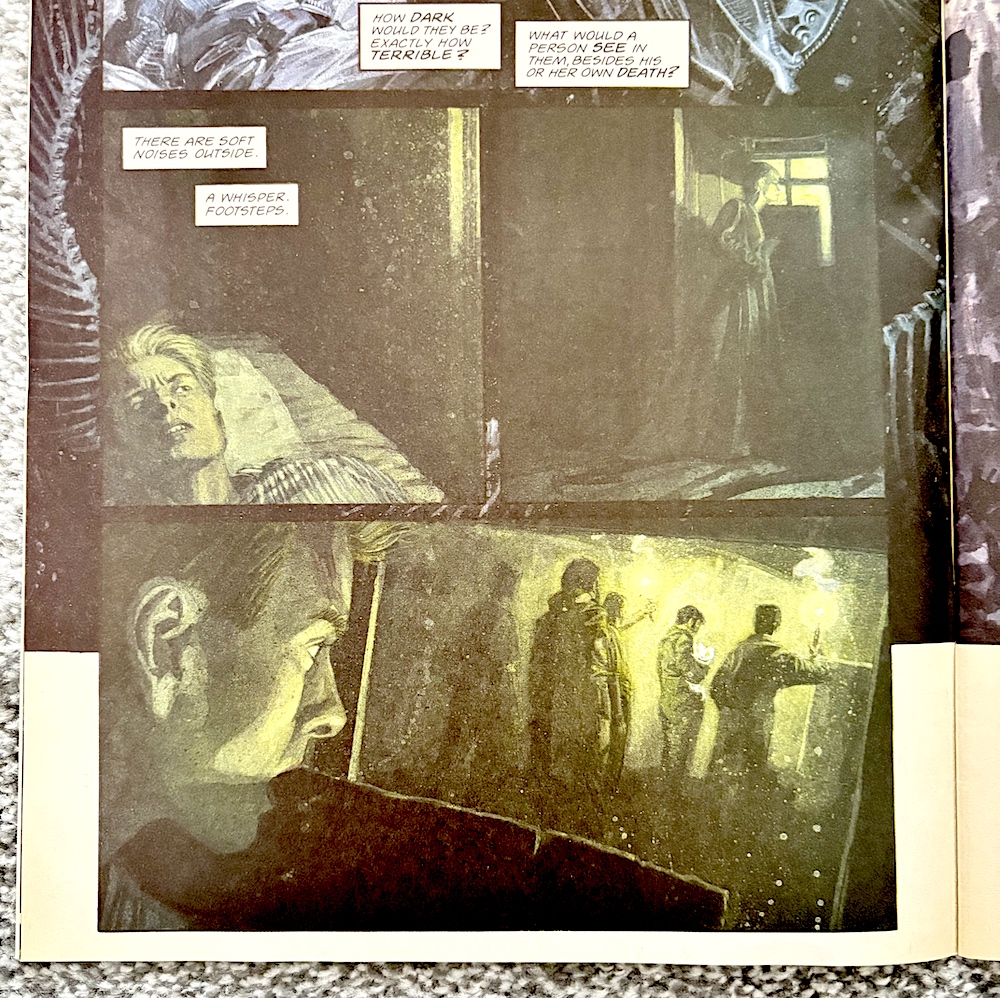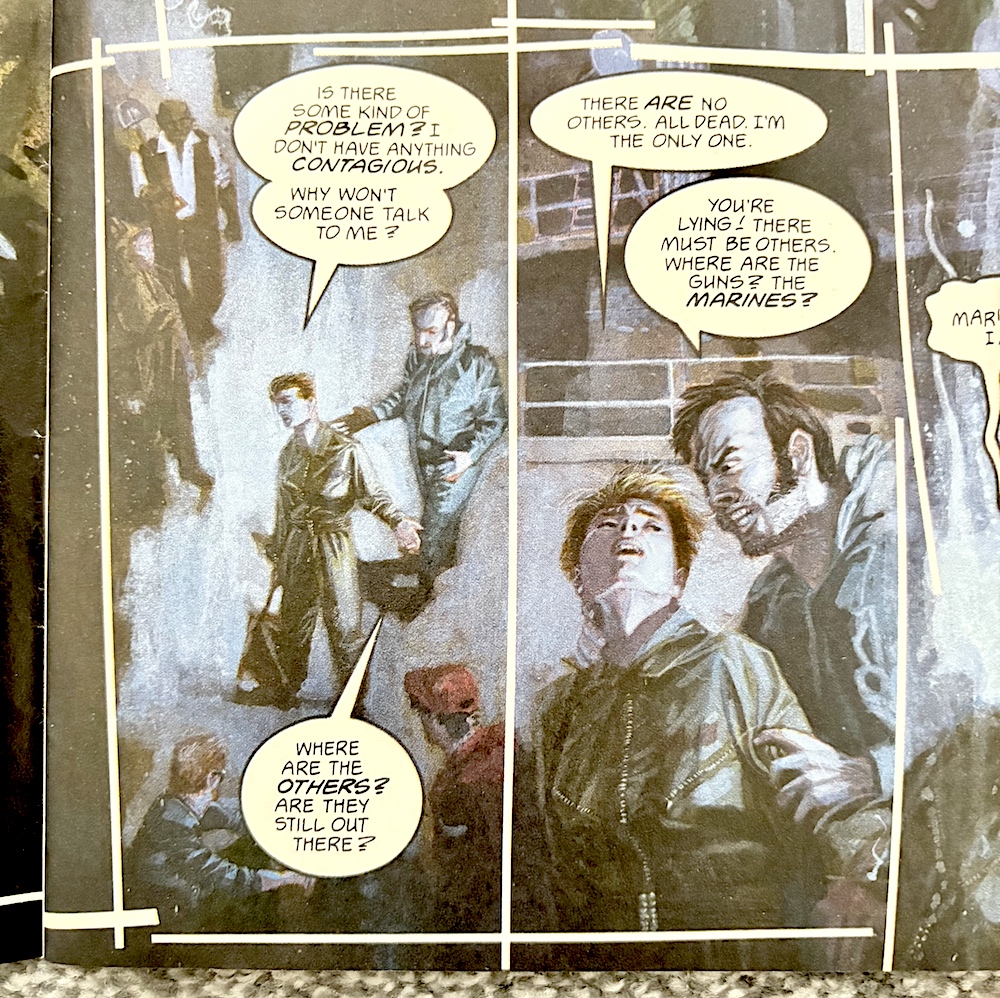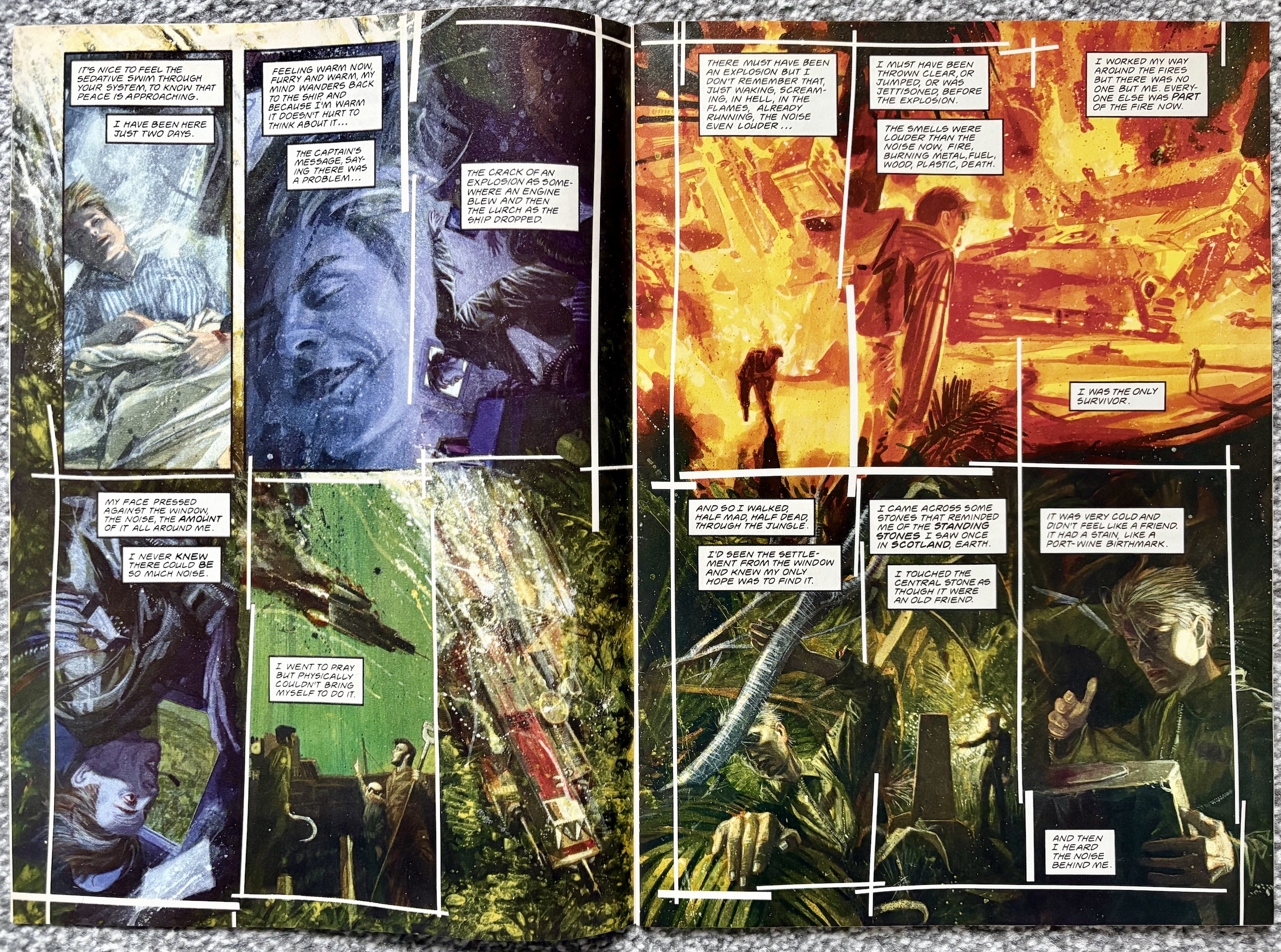 For the first few panels of the story I thought it was set underwater (teenage me would’ve been lost, no doubt) but Peter Milligan’s (Eagle, Egypt, Skin) story begins in a more familiar setting with a crashing spaceship. Of course I assumed the ship had been in distress because of an alien but we soon find out this story’s alien is actually already on the planet where Ann McKay finds herself as the lone survivor of the crash.