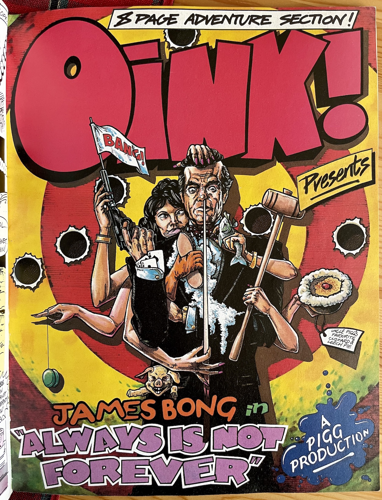 The plasticine cover was a step up from Ian’s already brilliant one for the first OiNK! Holiday Special and is probably the most iconic OiNK cover of all, with a story to match. “When we sent in the transparencies of the pig face and bottom with the artwork for the printer to process, Bob Paynter at IPC didn’t spot that the pig’s star-shaped bum was partly exposed and not completely hidden by the pig’s curly tail,” explains Patrick. “It was only when the proofs came back from the printer that Bob spotted it and deemed it too rude to be published. So we had to get photographer Ian Tilton to retake the shot with the pig’s tail completely obscuring the star-shaped bottom.” (You can read all about that and actually see those original transparencies in my chat with Ian.)