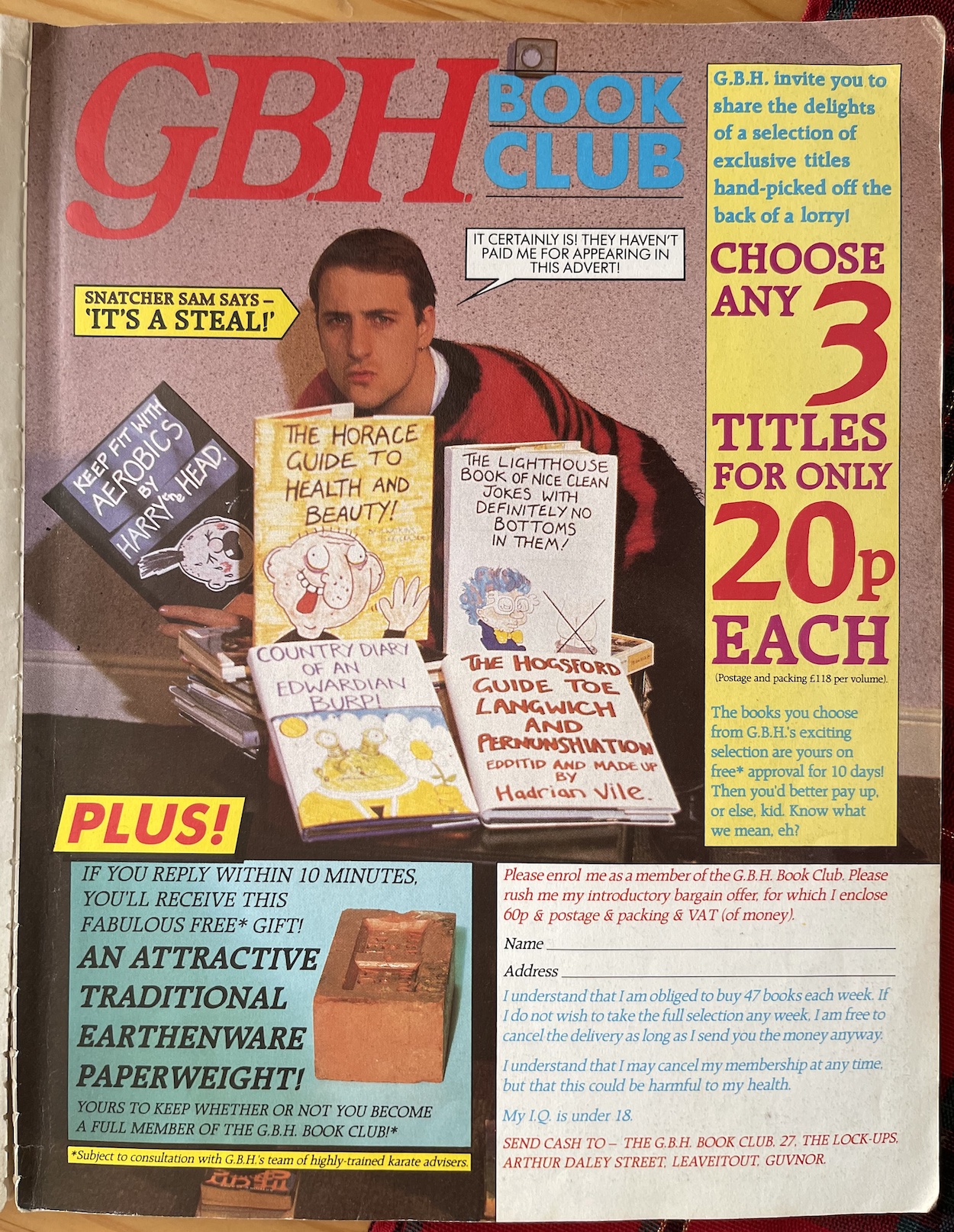 This is one of my most memorable pages, with Marc Riley as the not-at-all inconspicuous burglar, Snatcher Sam in GBH’s Book Club, a take on those book and video clubs that were so popular in the 80s and 90s. Magazines and comics were filled with them, promising cheap titles to begin with as you sign yourself up to buying a certain amount at full price over a year. I was a member of the Britannia Video Club, remember them? That’s why I loved this so much, along with the usual over-the-top nature of the GBH madverts and just look at all those book covers they’ve created for the photograph. Now, 35 years later it’s the effort put into these daft pages that I really appreciate.