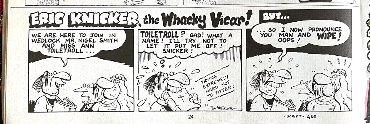 Annuals are created far in advance of their release dates so when this one was being put together the ever fantastic Tom Paterson was still a contributor to the comic. Written by the pun-tastic Graham Exton, Eric Knicker the Whacky Vicar may only have been a tiny quarter-page strip but it left a lasting impression on little me during Christmas 1987 as I tittered and giggled and shared the joke with friends and family. A lot better than any cracker joke.