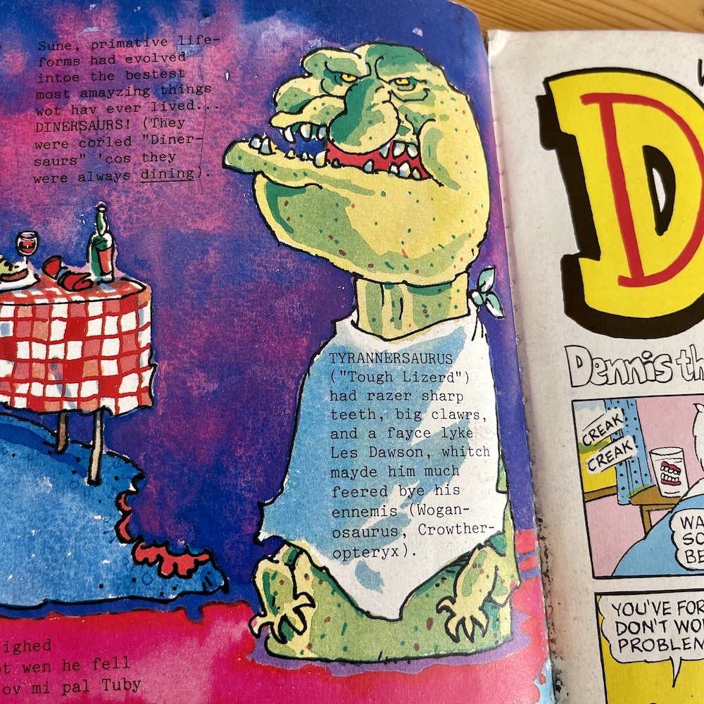 Hadrian Vile’s usual diary entries take a back seat to a selection of pages chronicling his Interleckshual guide toe Nacheral Histry, although he does take some short cuts to get from the evolution of life to the 1980s. His usual know-it-all persona is, as always, hilariously wrong in almost every way. In his fortnightly diary he was the most intelligent person in any room. Well, in his own mind anyway and here his guide to everything from dinosaurs (the hilarious looking Tyrannosaurus rex above is a highlight) to Ford Sierras.