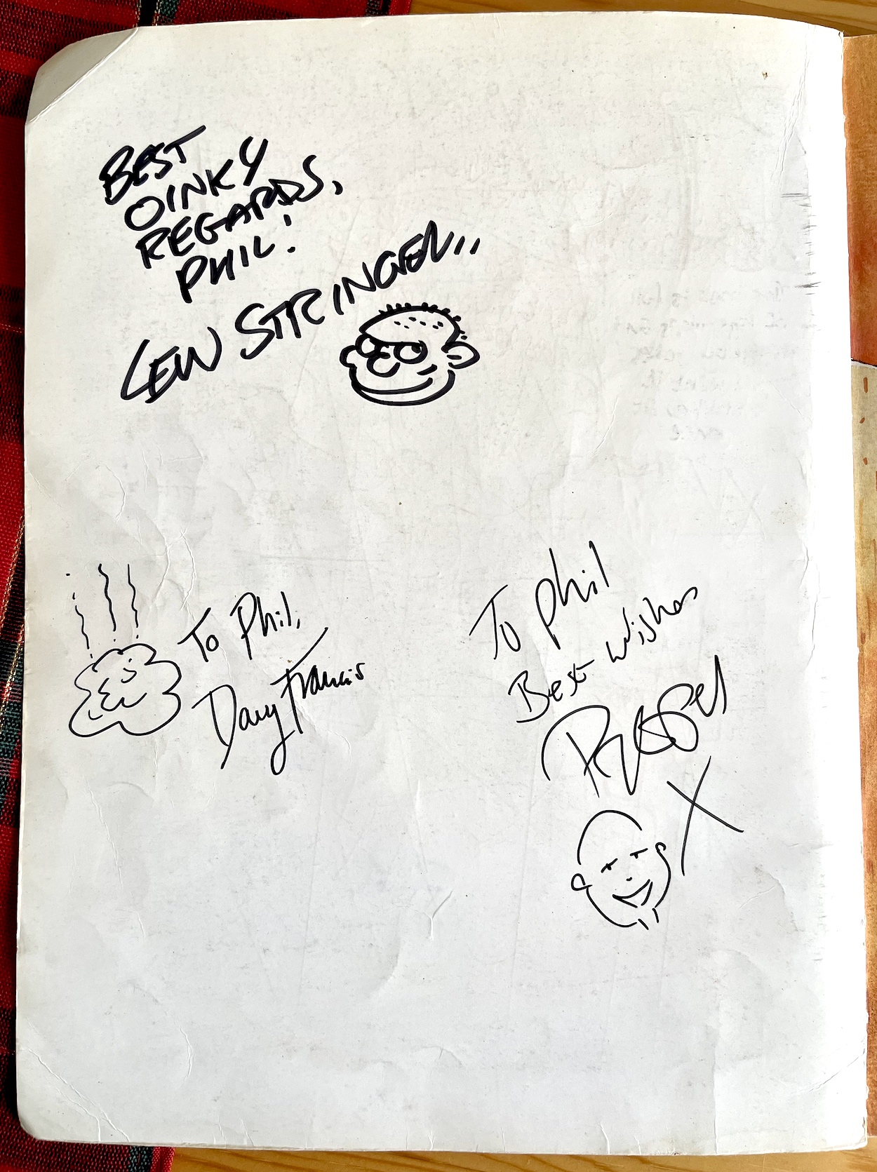 A couple of puns, funny art and a grinning Uncle Pigg reminding us (and telling those who were introduced to OiNK with the book) of his fortnightly comic, even if it wouldn’t be fortnightly for much longer. It’s a perfect end to a perfect book. It’s such a treasured item for me these days that it came with me to a comic con where Lew Stringer and Davy Francis signed it for me, and when Patrick Gallagher visited me at my home a few years back he added his. I intend to get the inside covers covered with as many squiggles as possible.