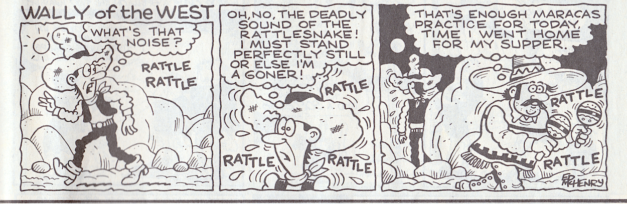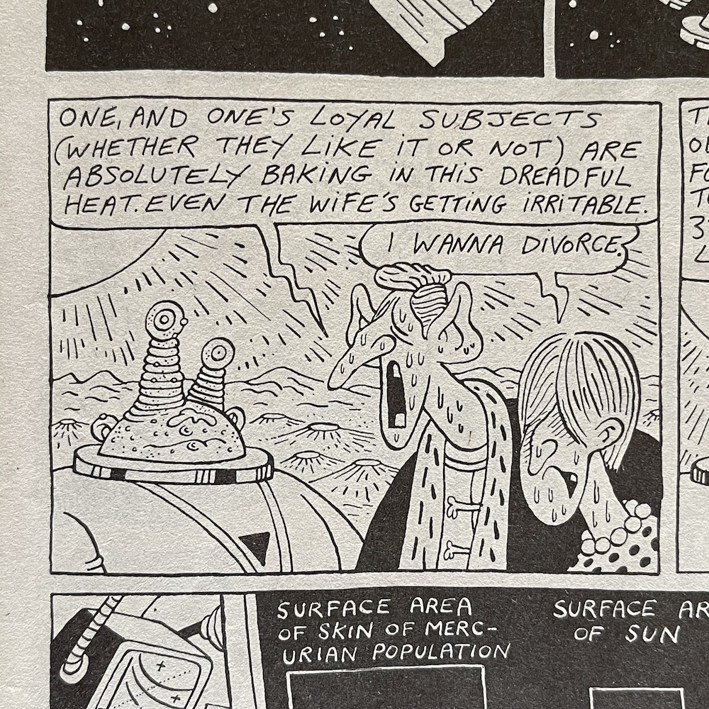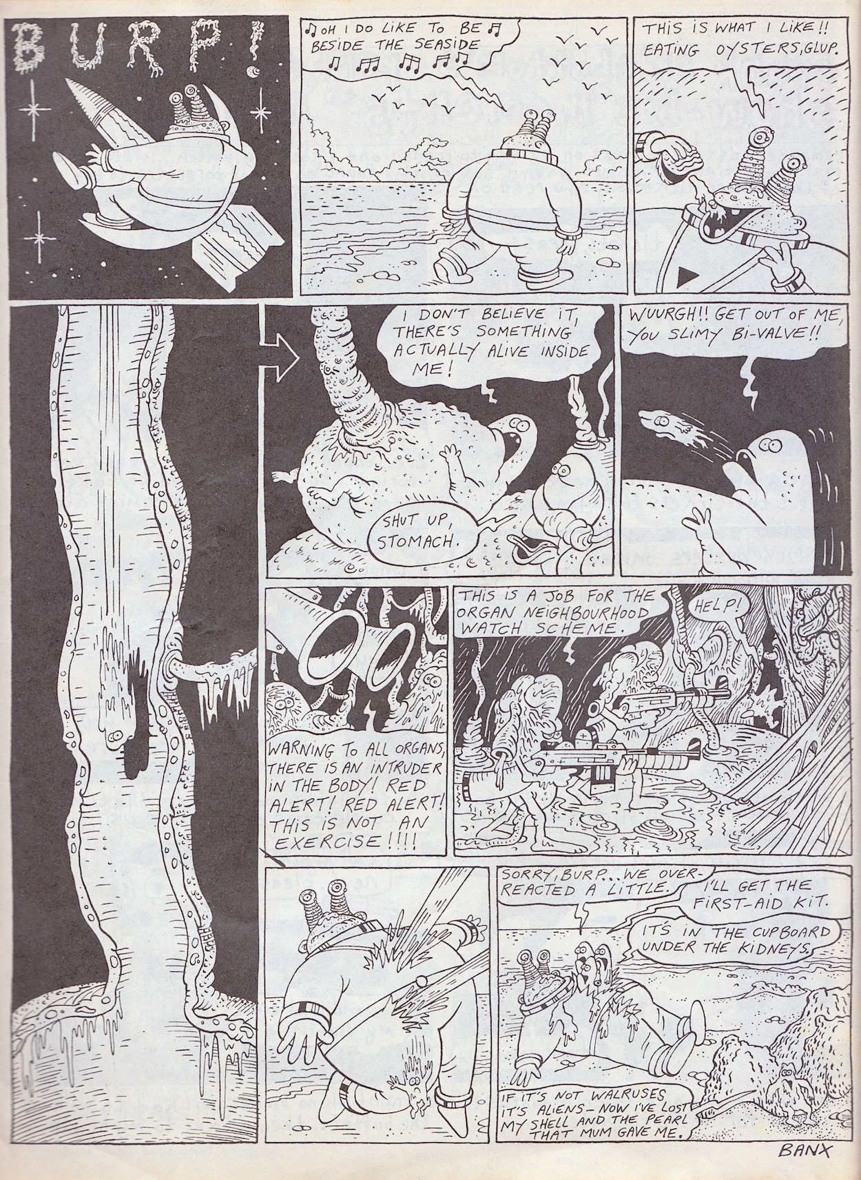 I think the phrase is, “Well that escalated quickly”. I find the expression on the oyster in the large panel on the left just hilarious, as is the stomach’s horrible realisation in the next. It seems stomach and myself share a similar view on the matter. My favourite Burp strips always involve his organs or gratuitous, over-the-top cartoon violence and this strip manages to have both. Although, I do wonder where his pet specimen from Uranus has got to, we haven’t seen them in months.