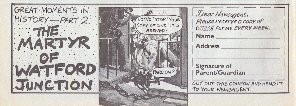 There’s a blink-and-you’ll-miss-it announcement on the cover of the latest OiNK from 35 years ago, and a rather big announcement at that. The art is by Marc Riley and despite his strips being loved his style is rather simplistic for a cover image. As a fan it didn’t matter to me, but would it have been too simple for any new readers the now-weekly OiNK was trying to attract? The little box on the right may have had more of the desired effect but I’m not sure if anyone would’ve noticed it on the shelves.