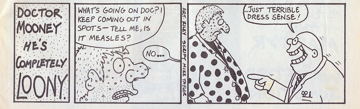 Something I’ve noticed in recent issues is how Marc Riley’s strips such as Harry the Head and When Dinosaurs Ruled the Earth are no longer being written by him. He may still be drawing them but a range of different talent has been scripting his creations including Doctor Mooney He’s Completely Looney, written here by Mike Taylor, one of OiNK’s contributing artists who has drawn everything from a GBH Christmas Catalogue to Ye Ballad of Snatcher Sam and the advert for the OiNK sweatshirt.