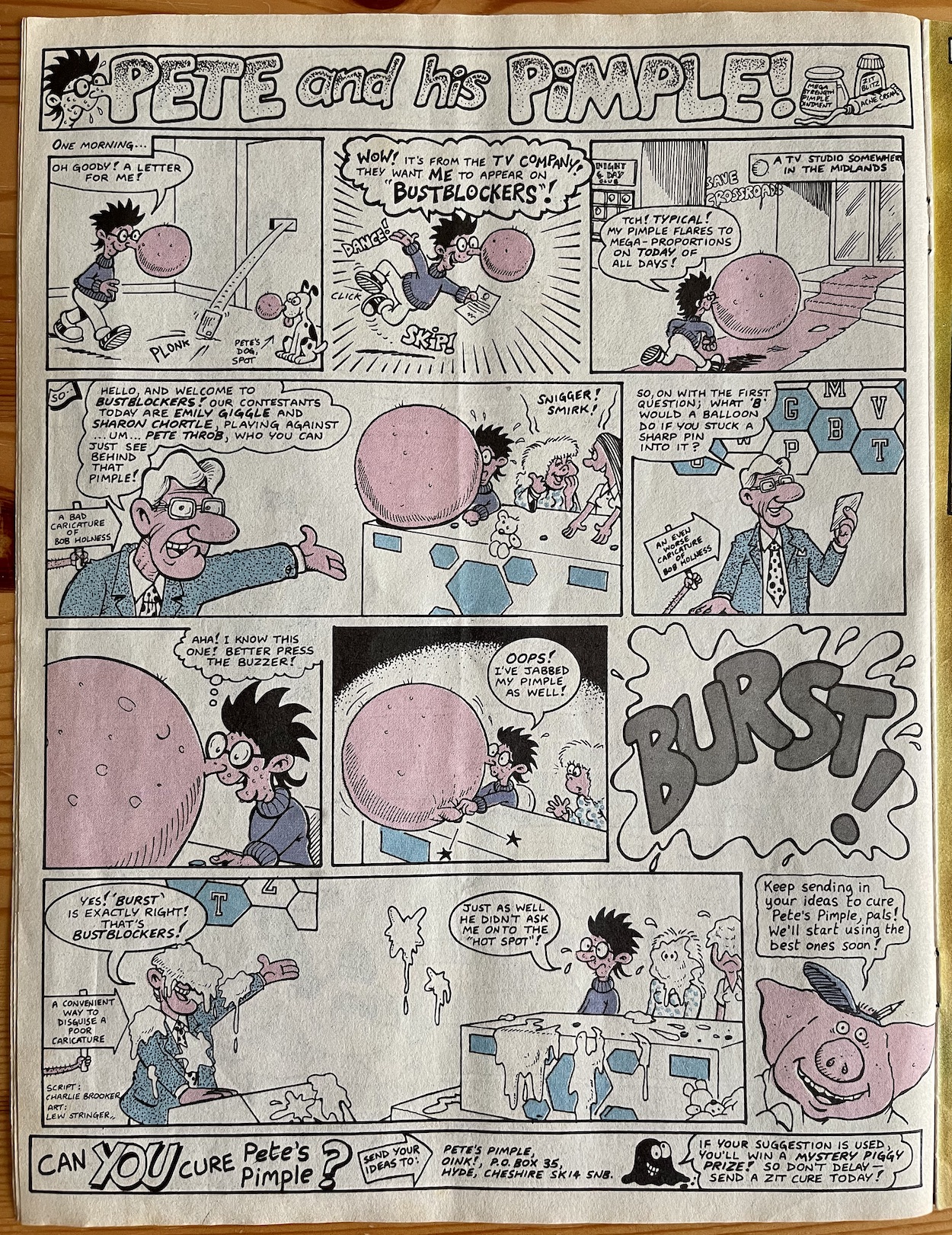 At the time of OiNK there was a certain teatime telly show which captivated everyone who watched it, despite it being a basic question and answer quiz. At ten-years-of-age I can’t remember knowing many of the answers the university students were asked but that didn’t matter, Bob Holness and that electronic Blockbusters game board made it, the whole family sitting together for half an hour. It appears Charlie Brooker was also a bit of a fan as he wrote a script for Lew Stringer’s Pete and his Pimple strip, the only time someone other than Lew wrote for the character.