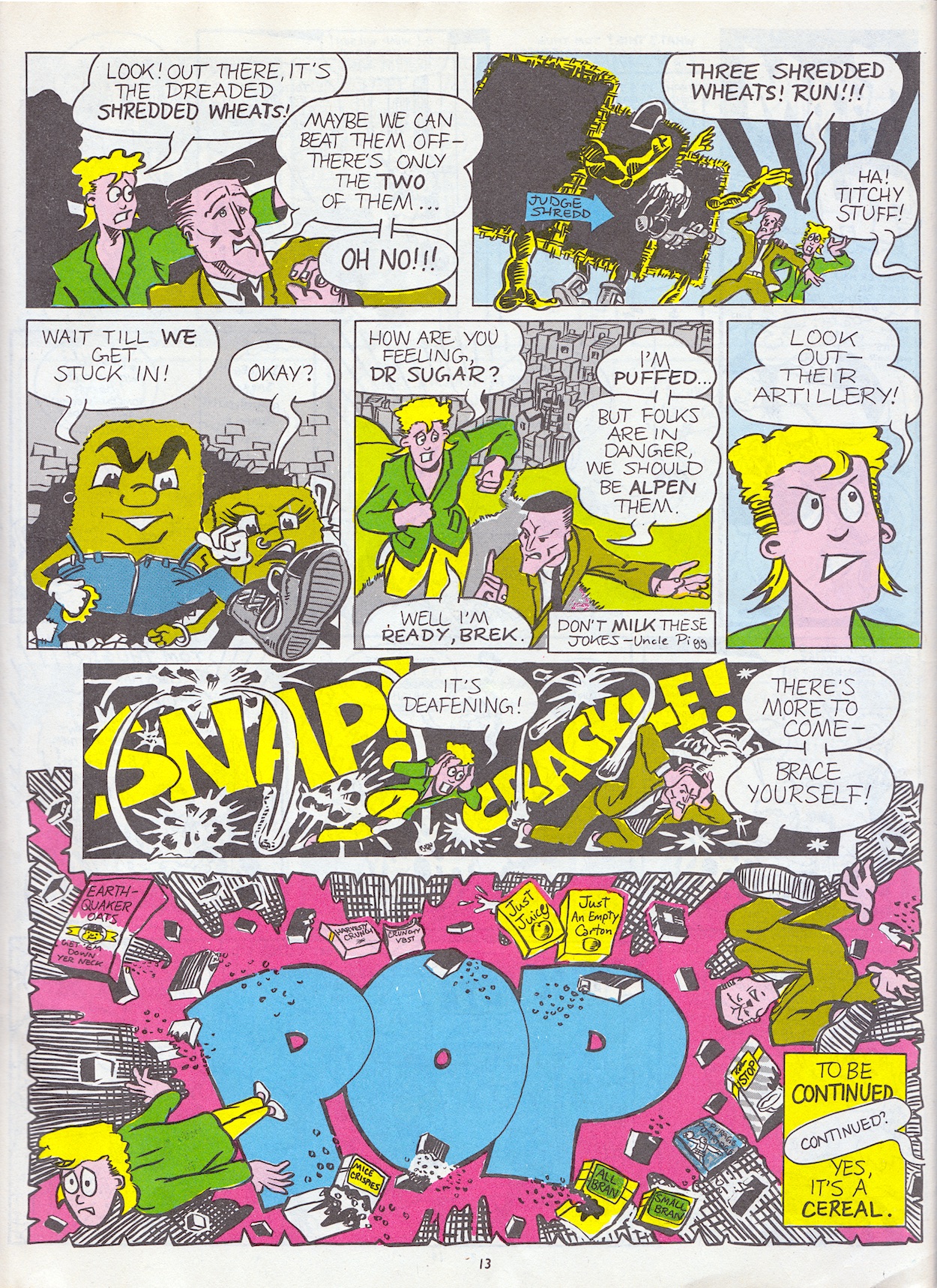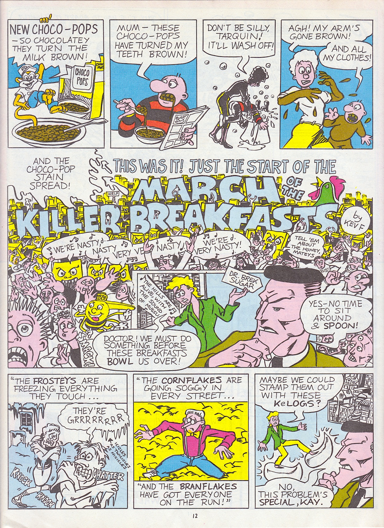 There’s something quite genius right there on page one, when Kev perfectly lays down two future jokes when he names his protagonist. To the reader it’s initially just a funny name tied in with the cereal theme, but later two perfectly timed puns in the same caption tell us why ‘Dr Brek Sugar’ was really given that name. This is one of Kev’s best and one of the funniest strips in OiNK. Out of all of his contributions I think it’s tied for first place with his time travelling professors we’ll meet in a monthly later in the year. It’s comedic genius and it’s inside a children’s comic.