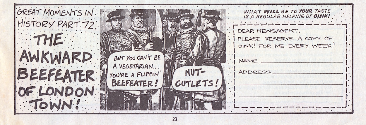 This change had worked before to phenomenal results when Marvel UK’s Transformers comic changed from a 32-page fortnightly to a 24-page weekly at the end of its first year and sales skyrocketed. Although, by the end of its fortnightlies there was so much awful filler material it was a blessing to have a more streamlined comic. Weekly OiNK would also get to that stage of feeling like a more streamlined experience packed with excellent content, rather than a thinner comic. But would it be too late by then for long-term readers? Stick around to find out.